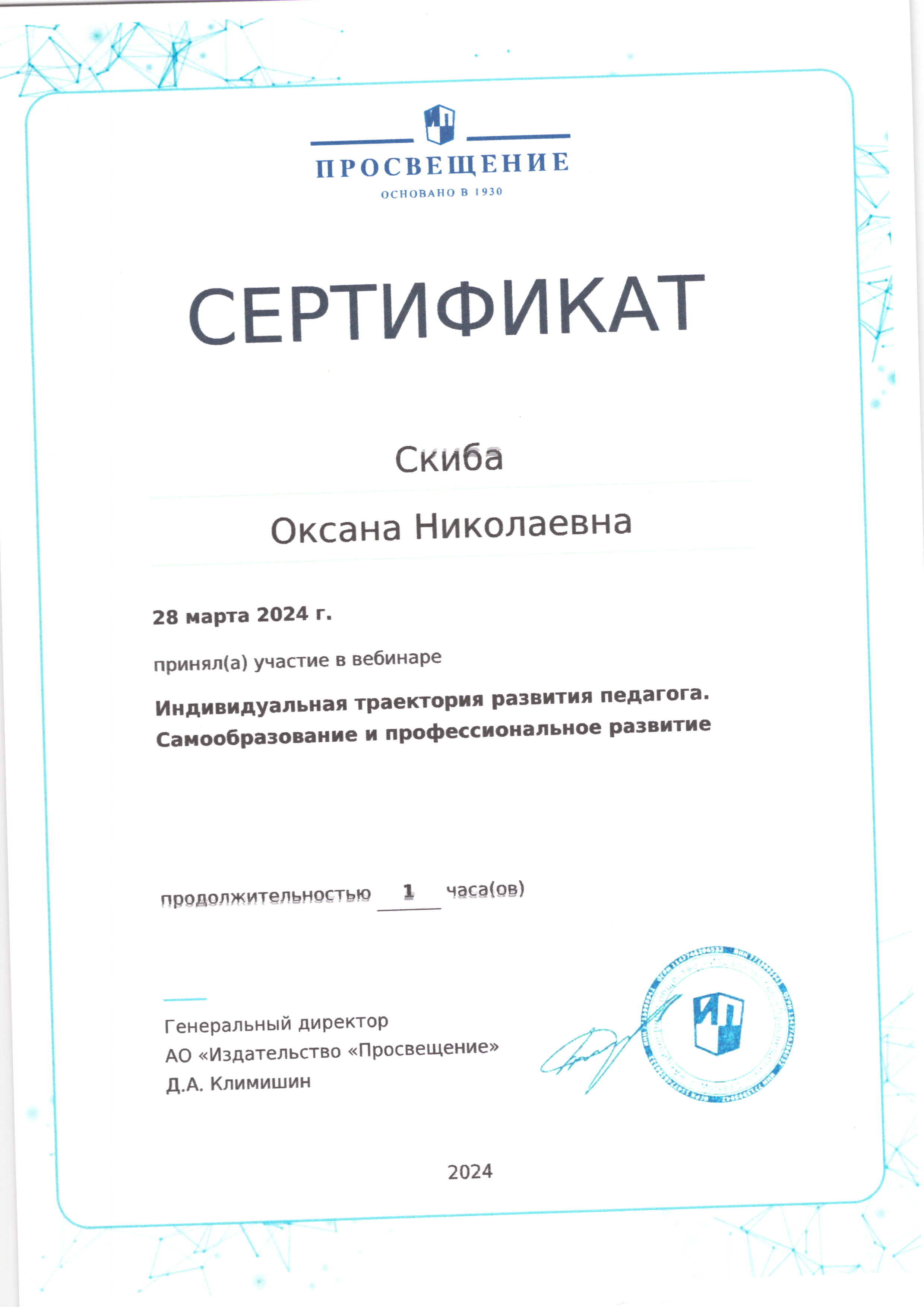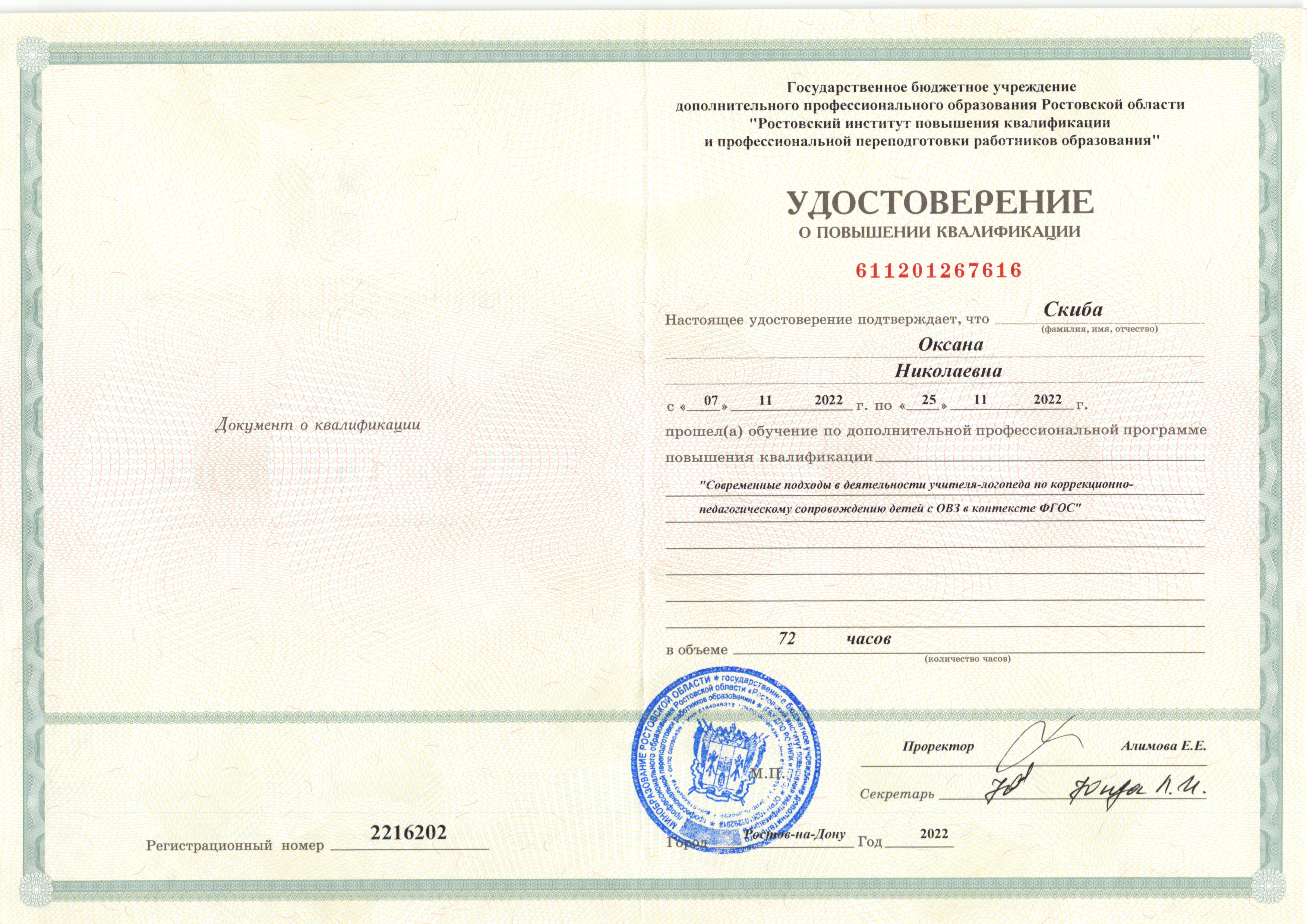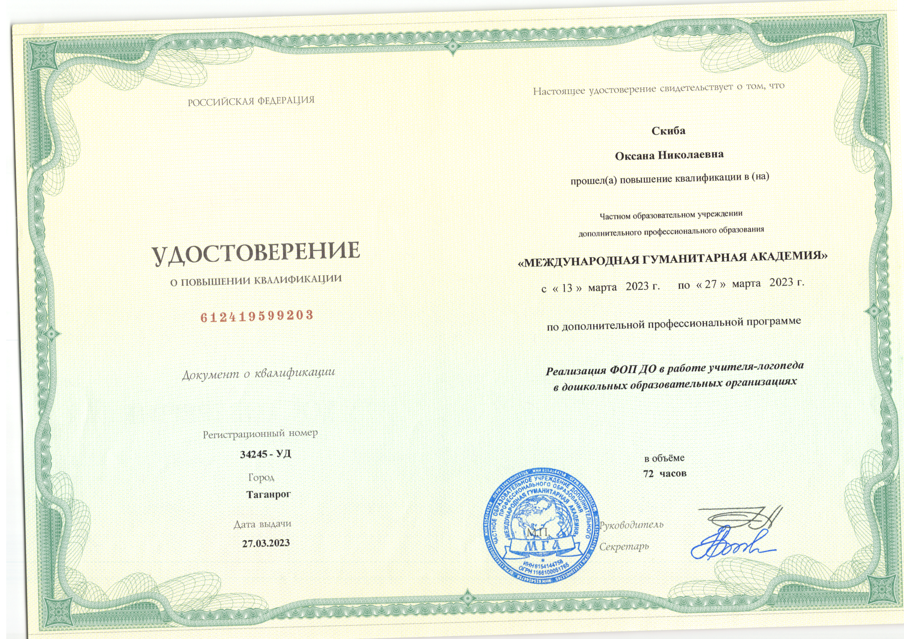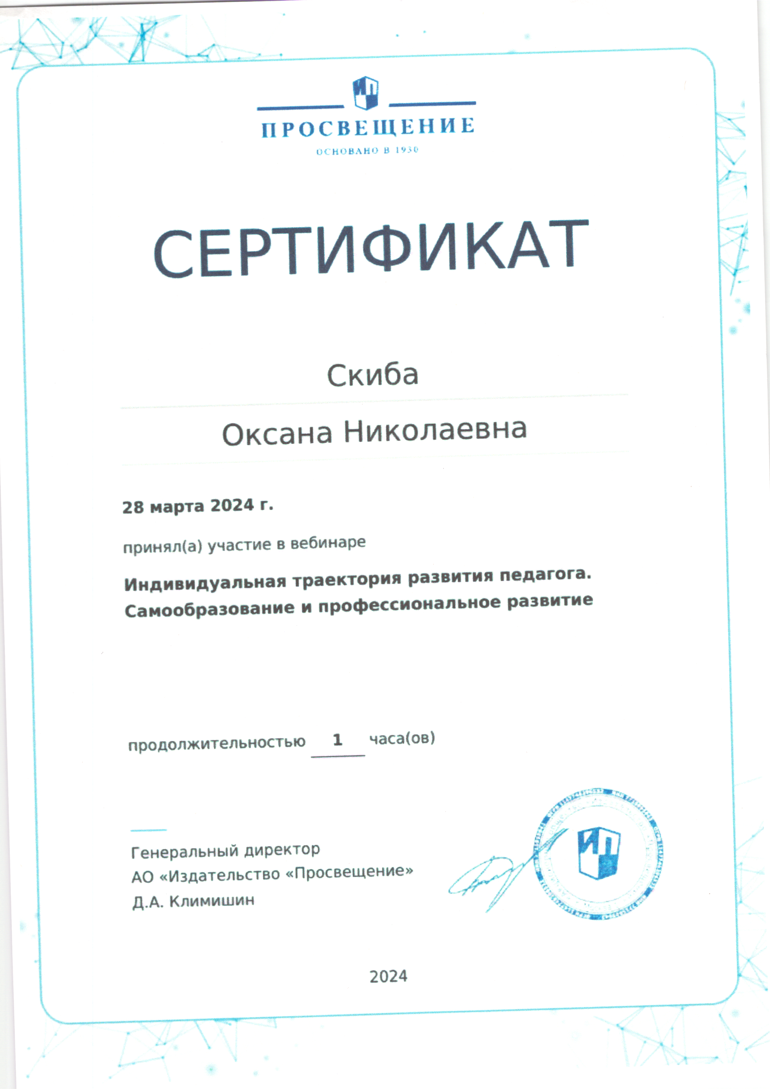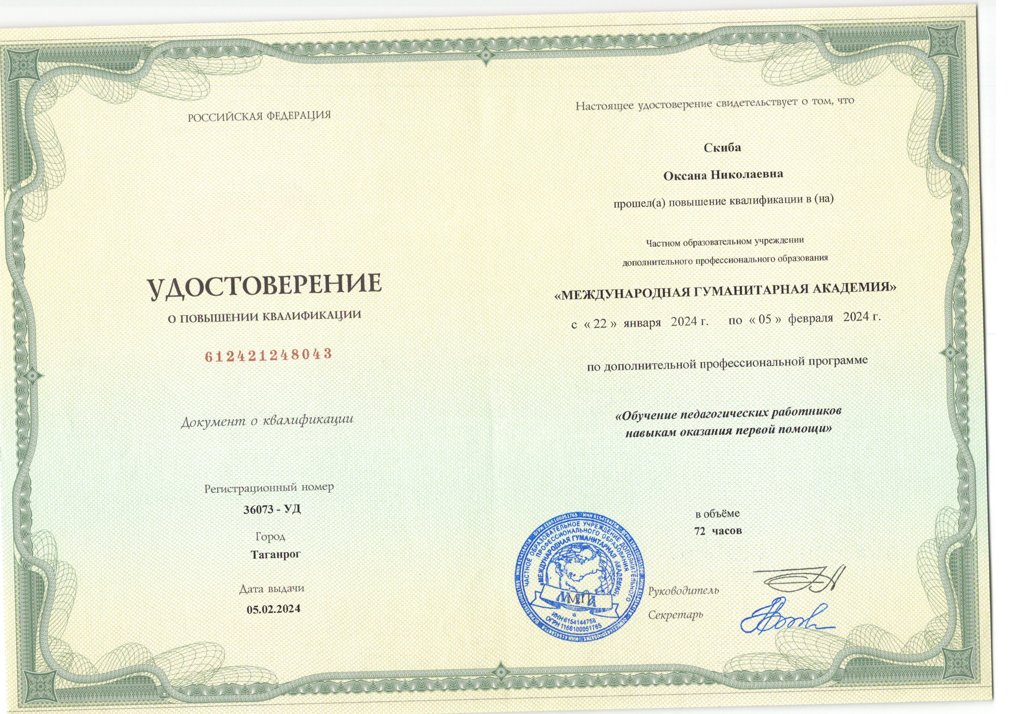 | Фамилия, имя, отчество | Скиба Оксана Николаевна |
