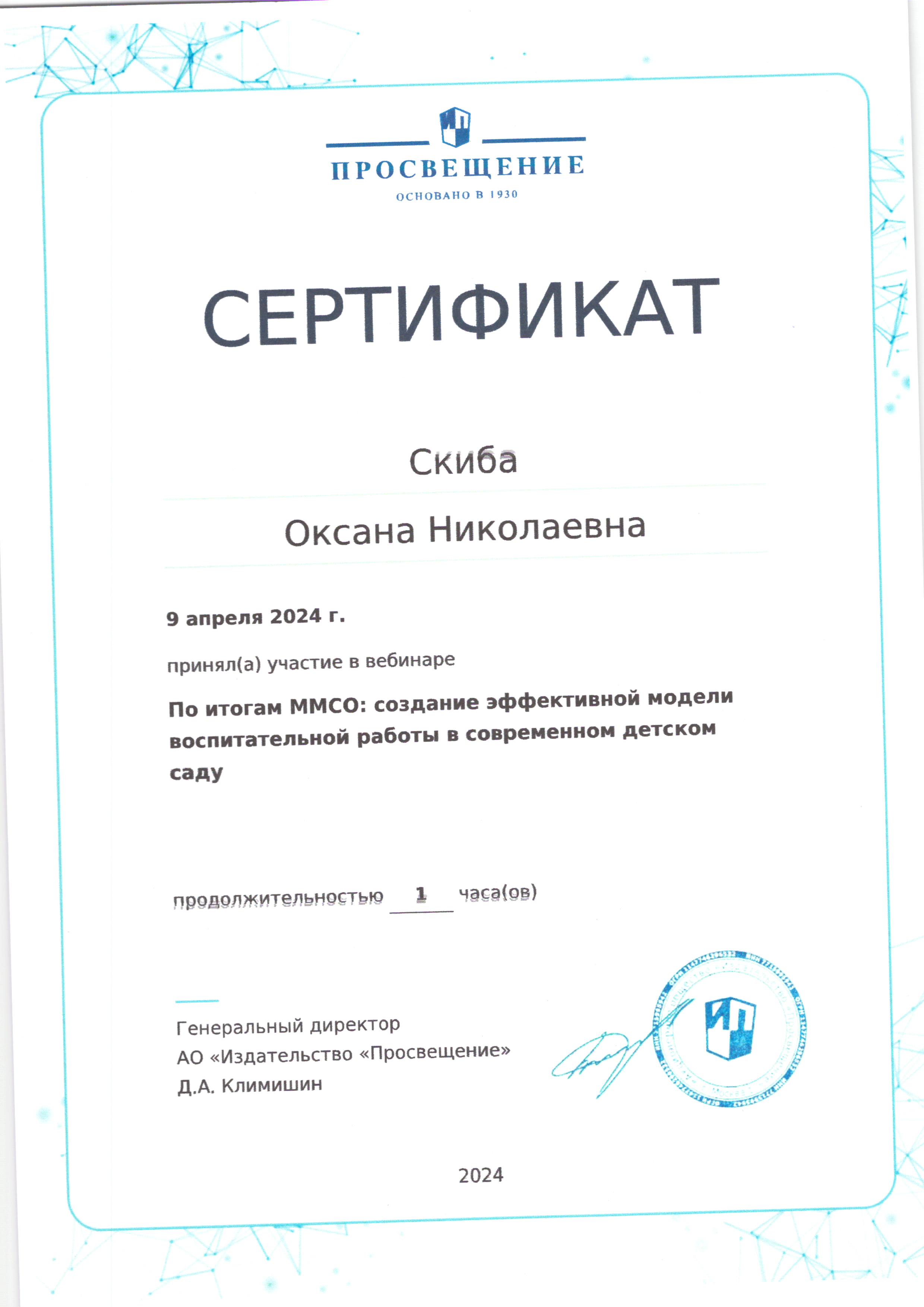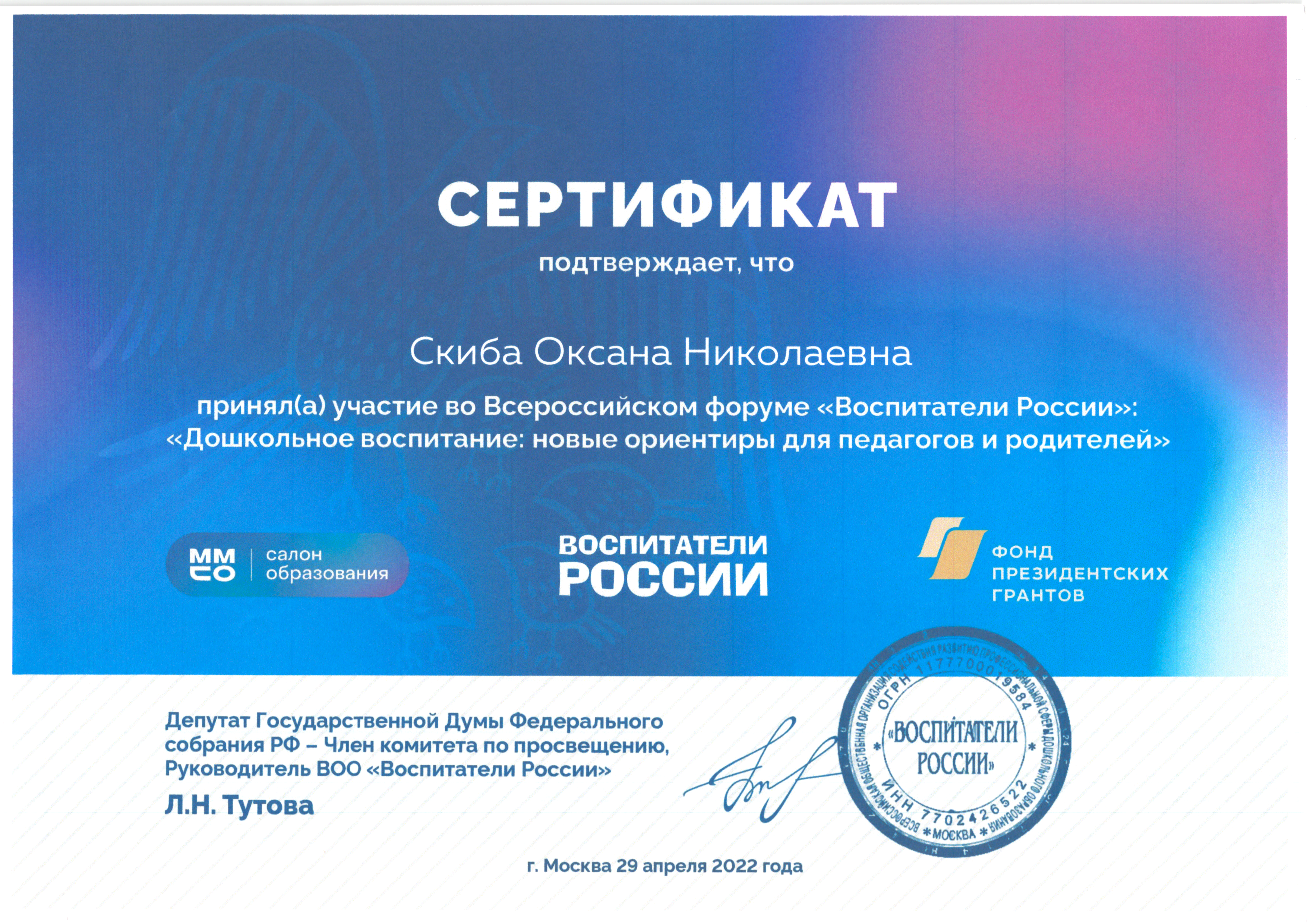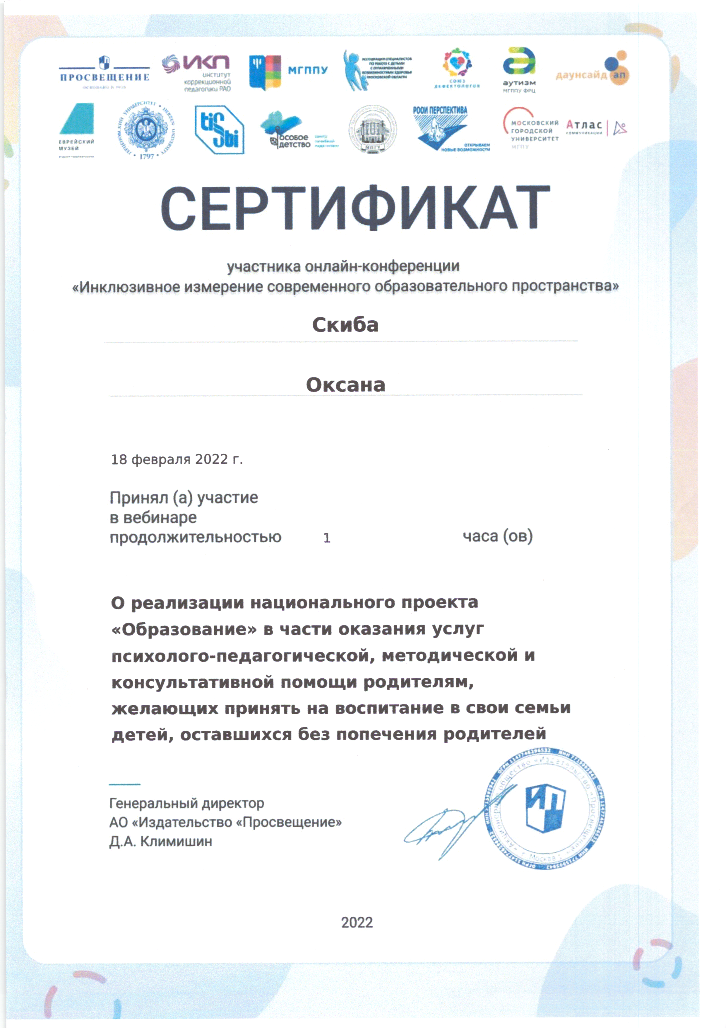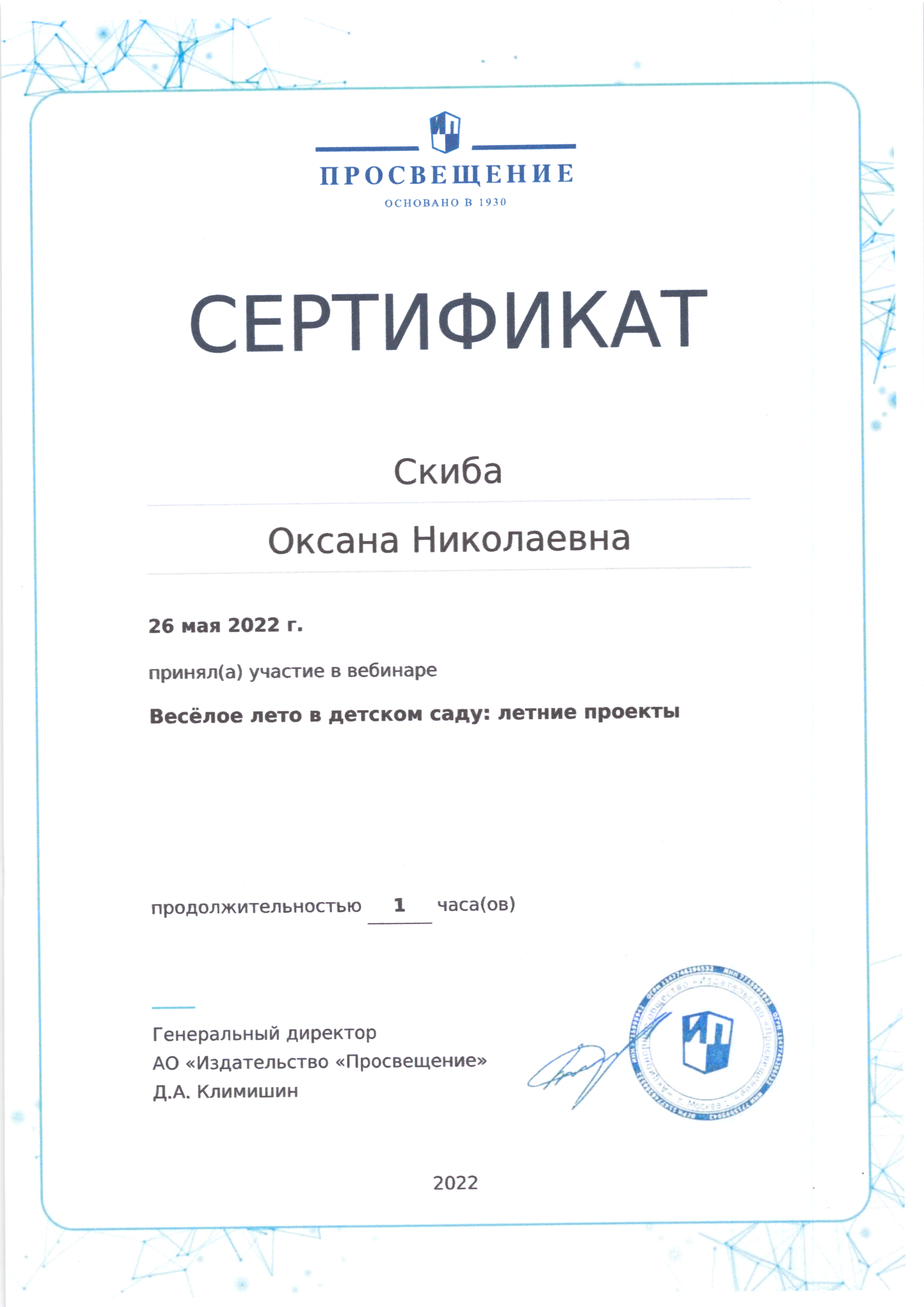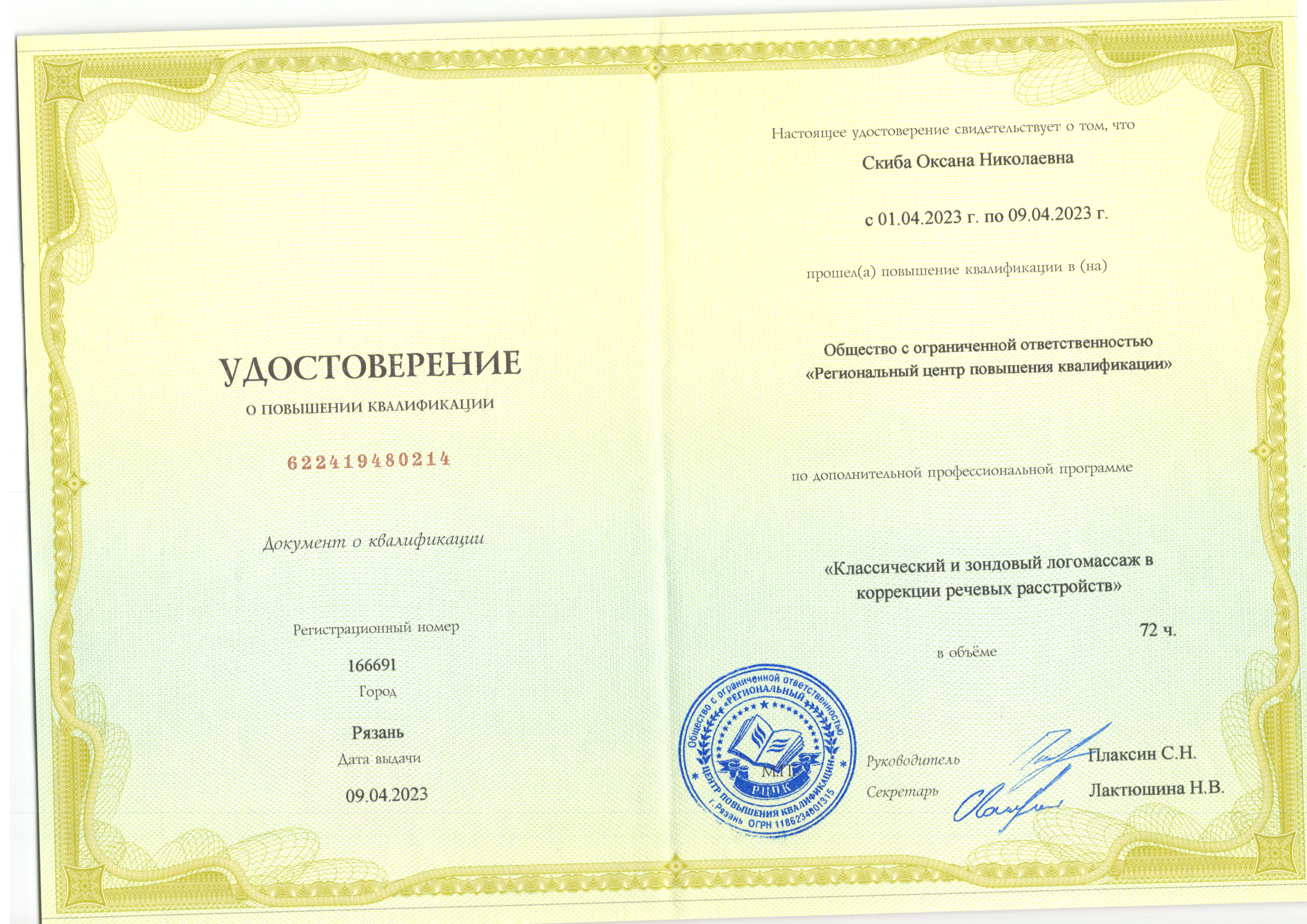 | Фамилия, имя, отчество | Скиба Оксана Николаевна |