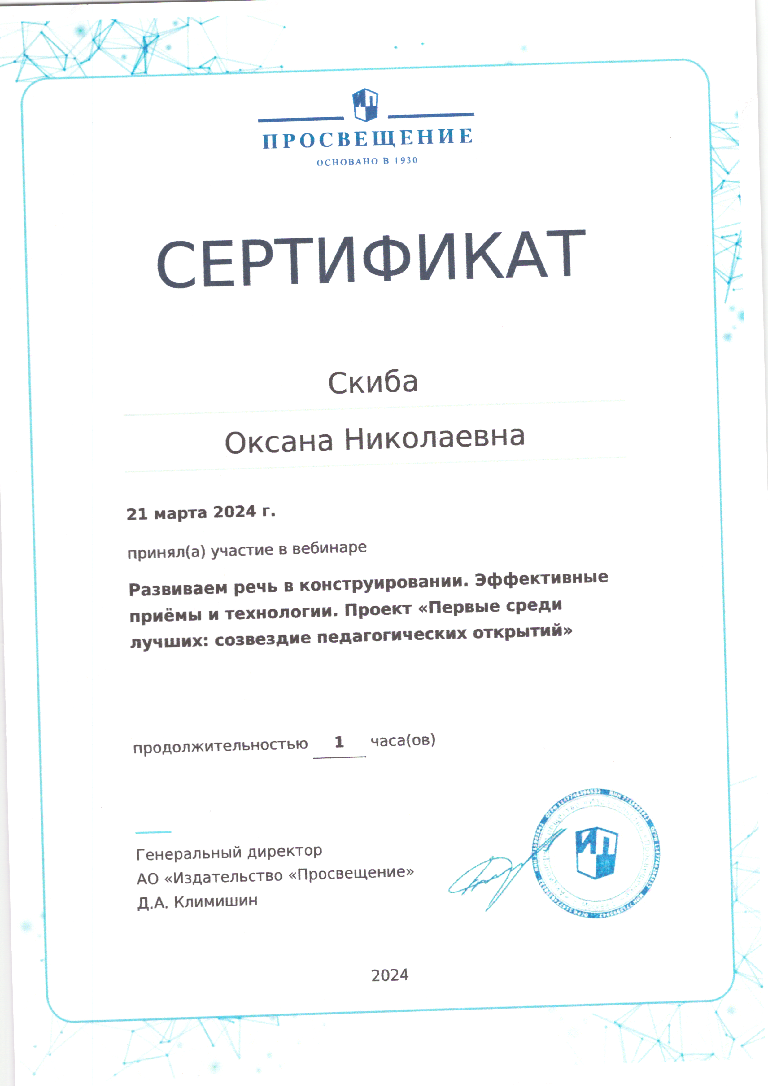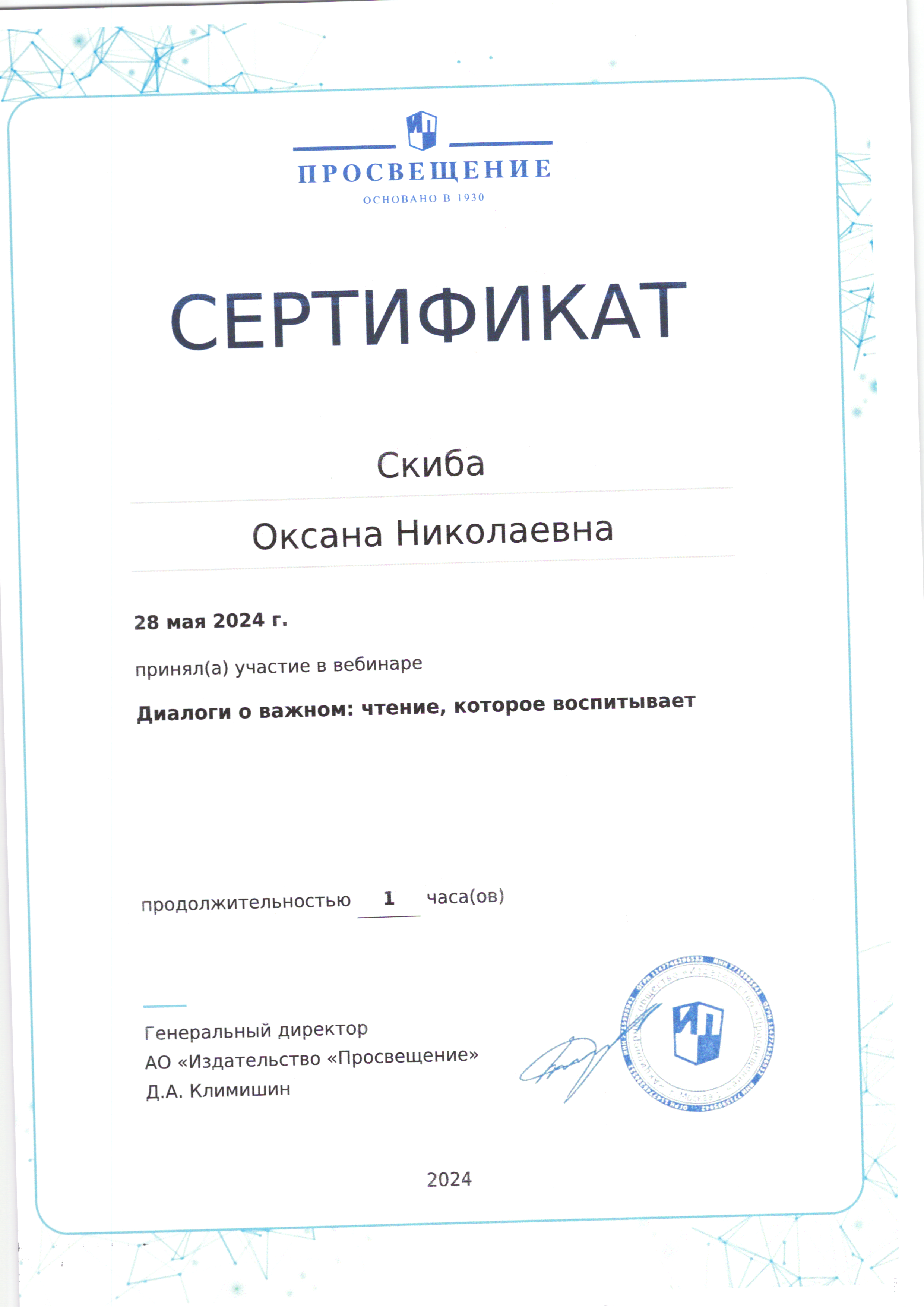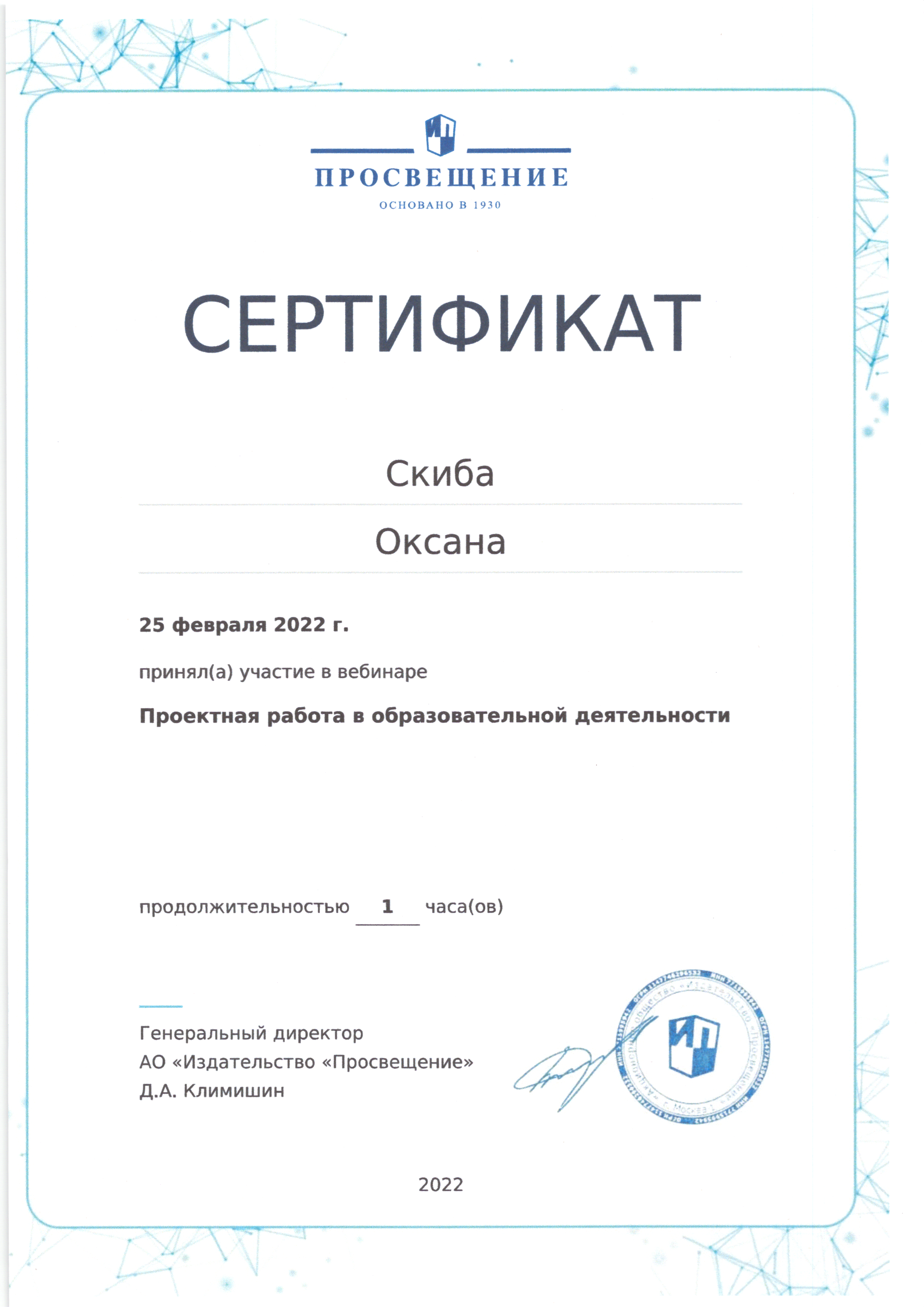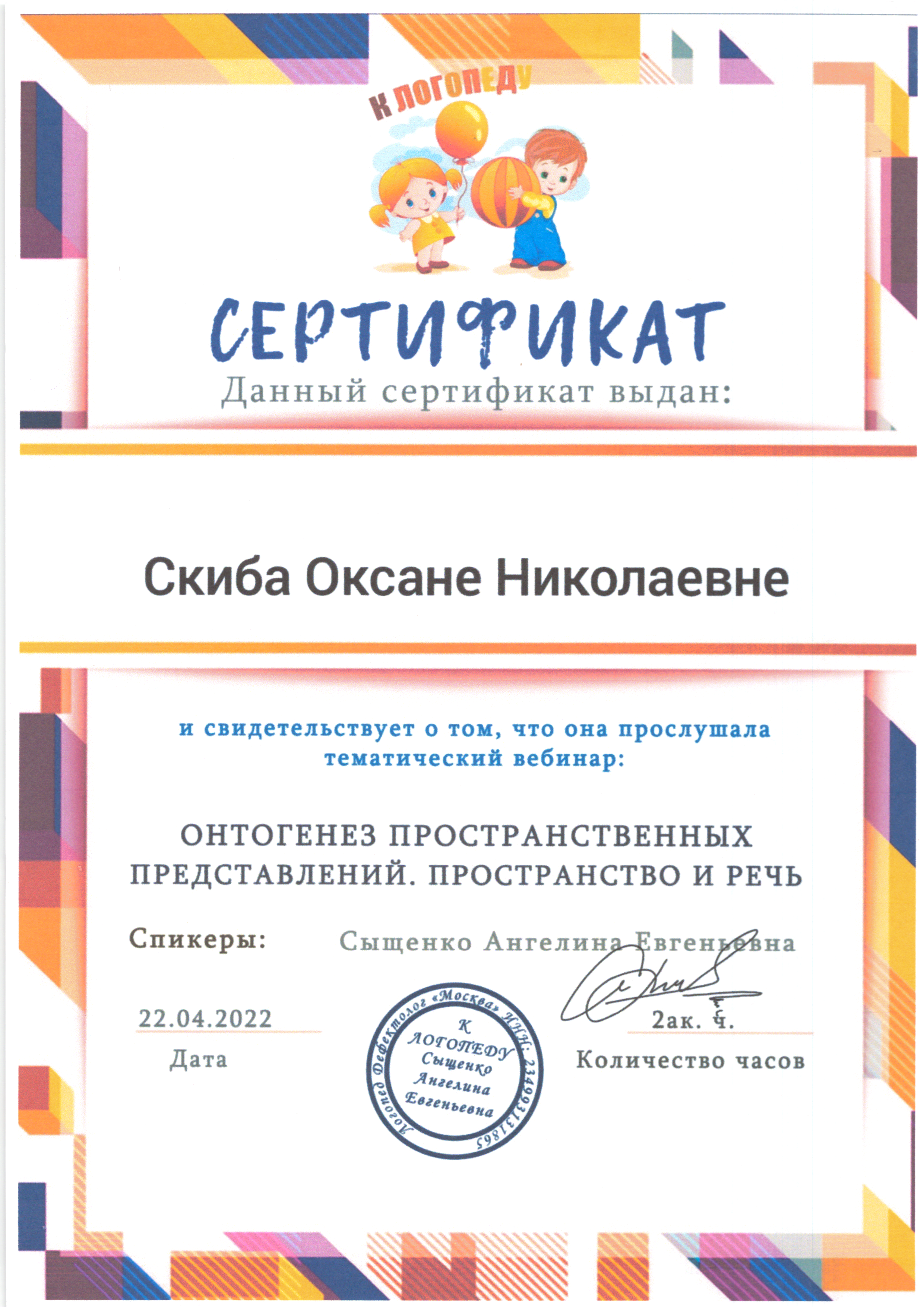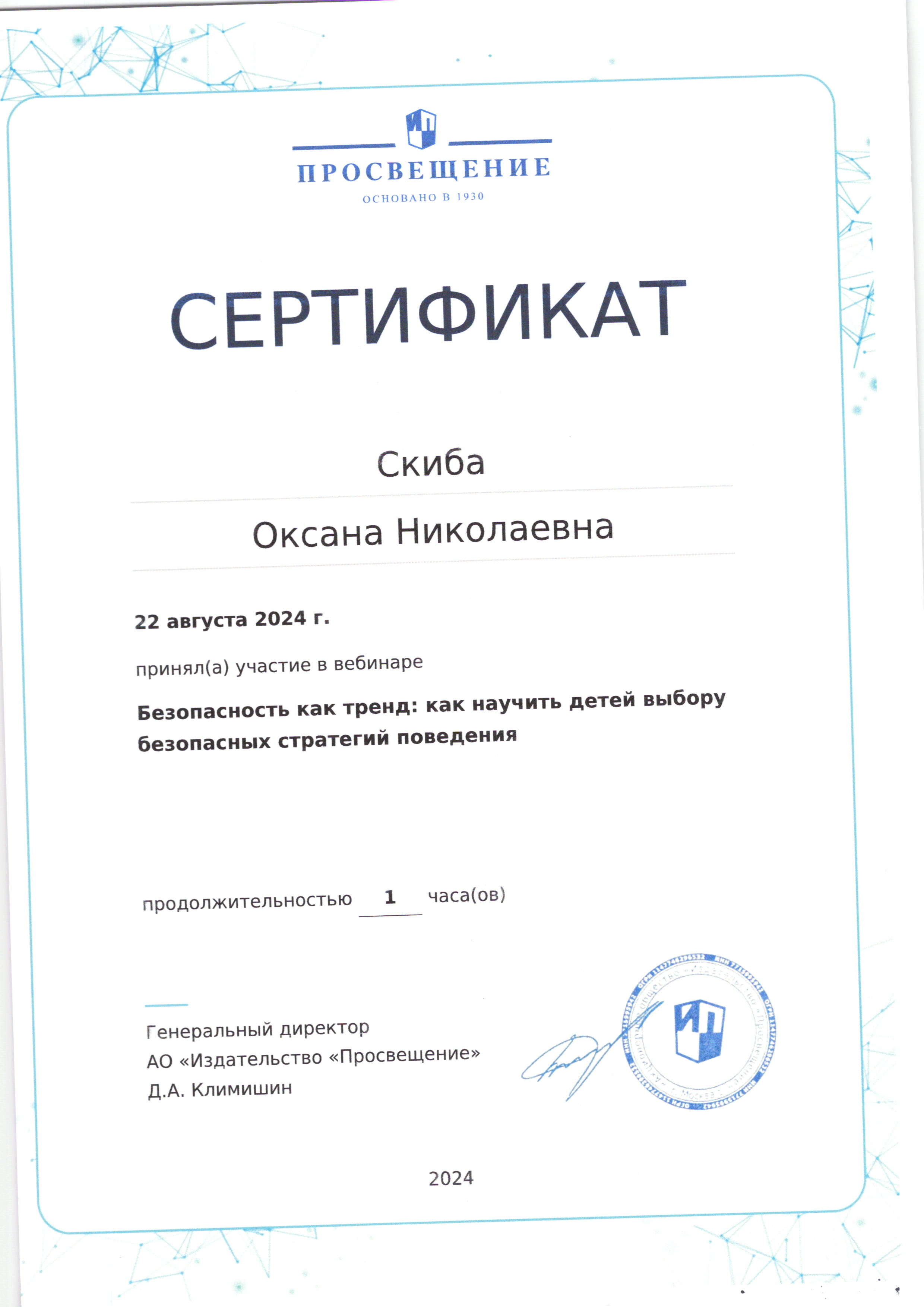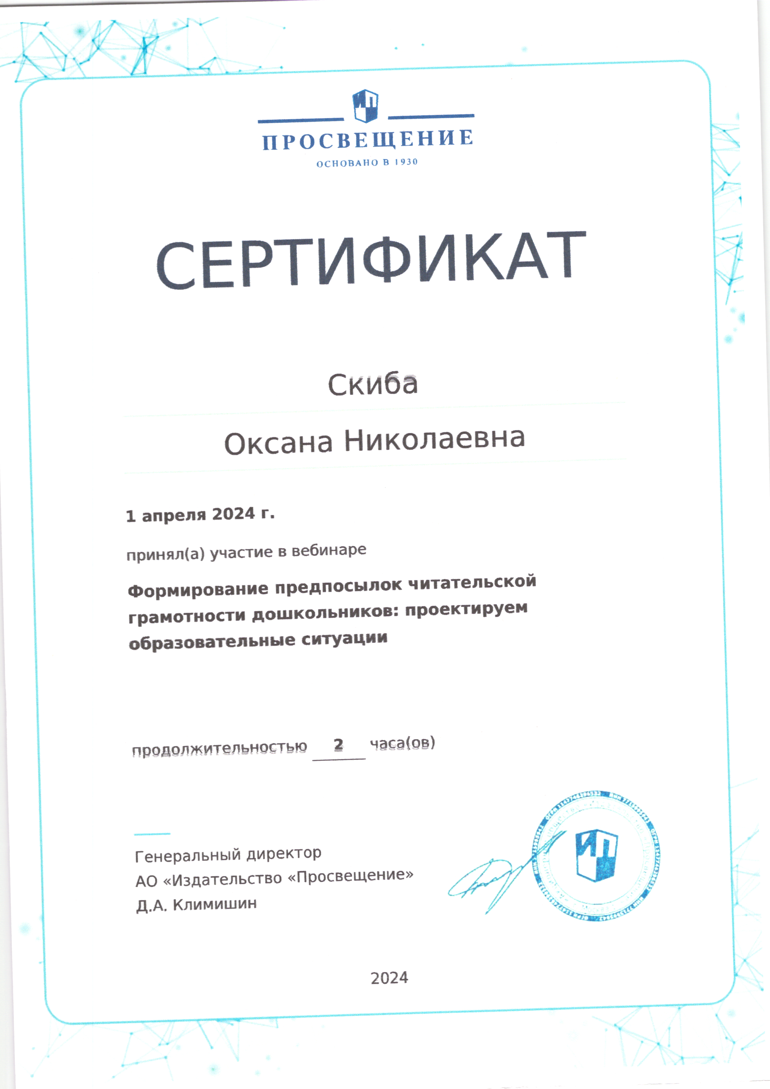 | Фамилия, имя, отчество | Скиба Оксана Николаевна |