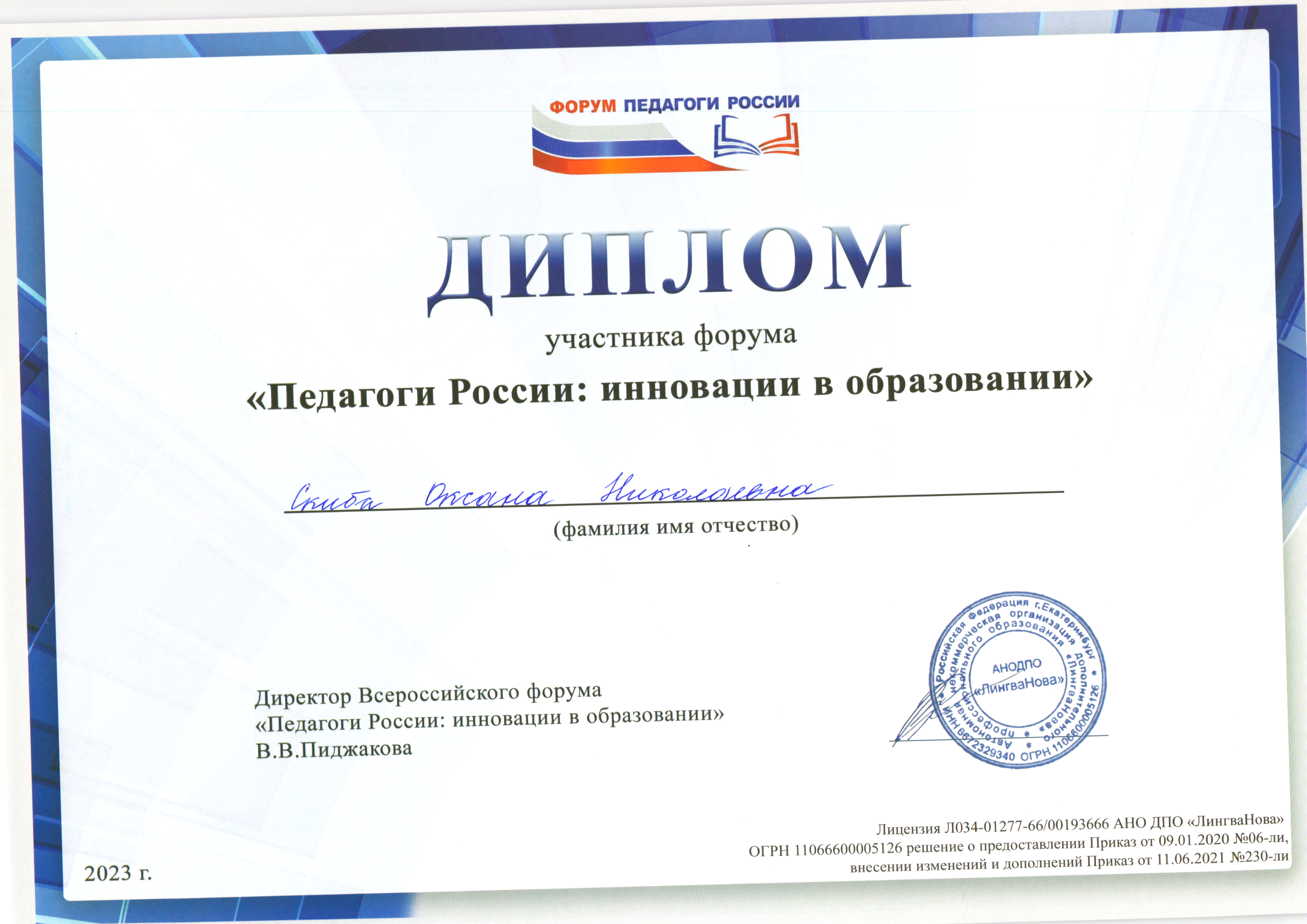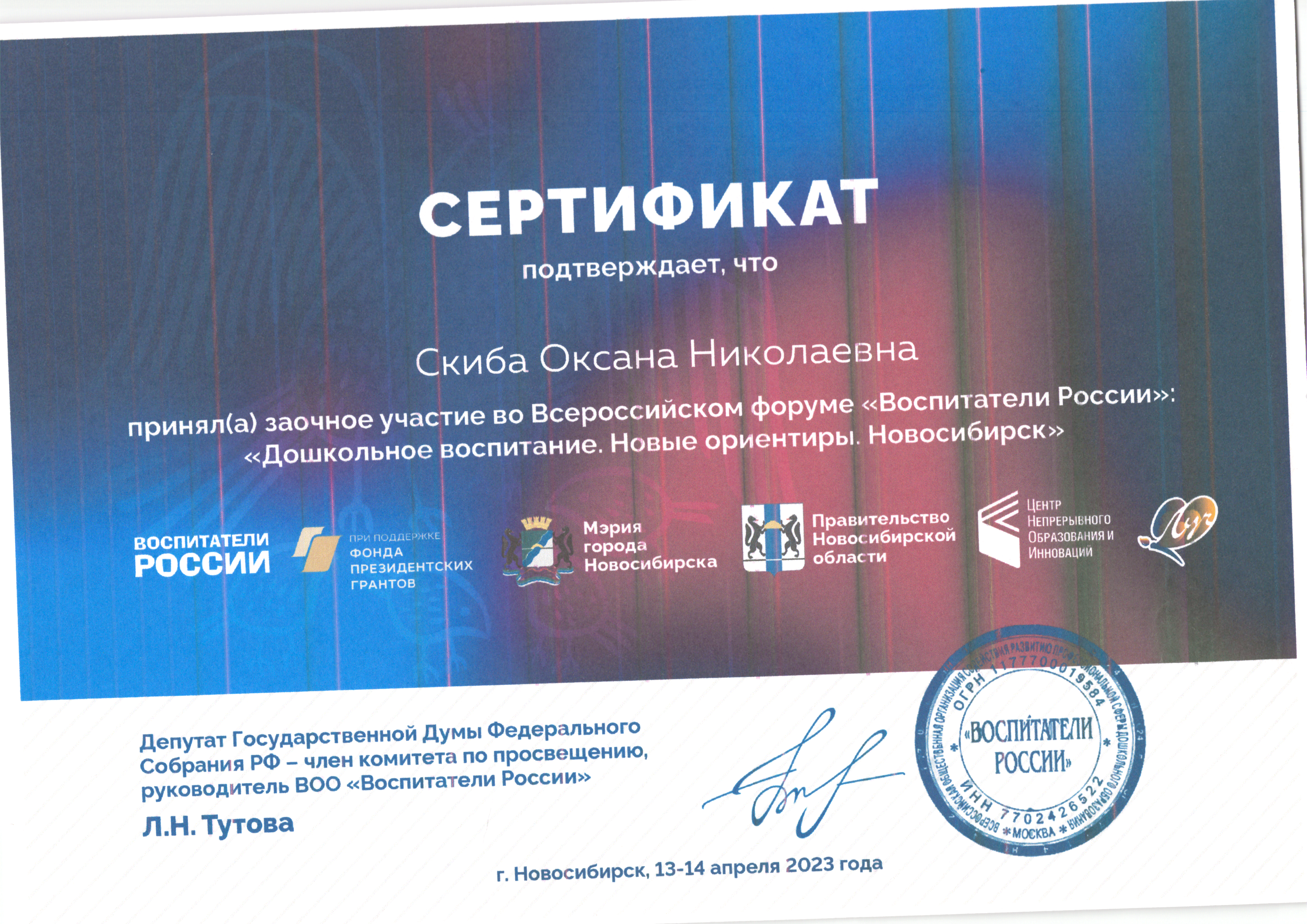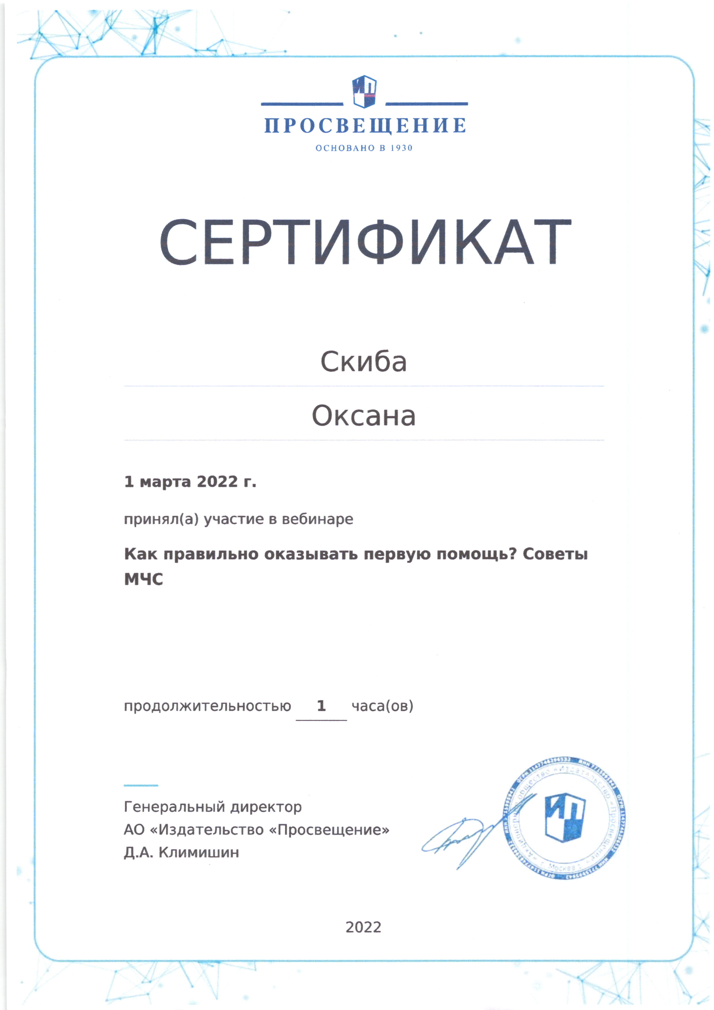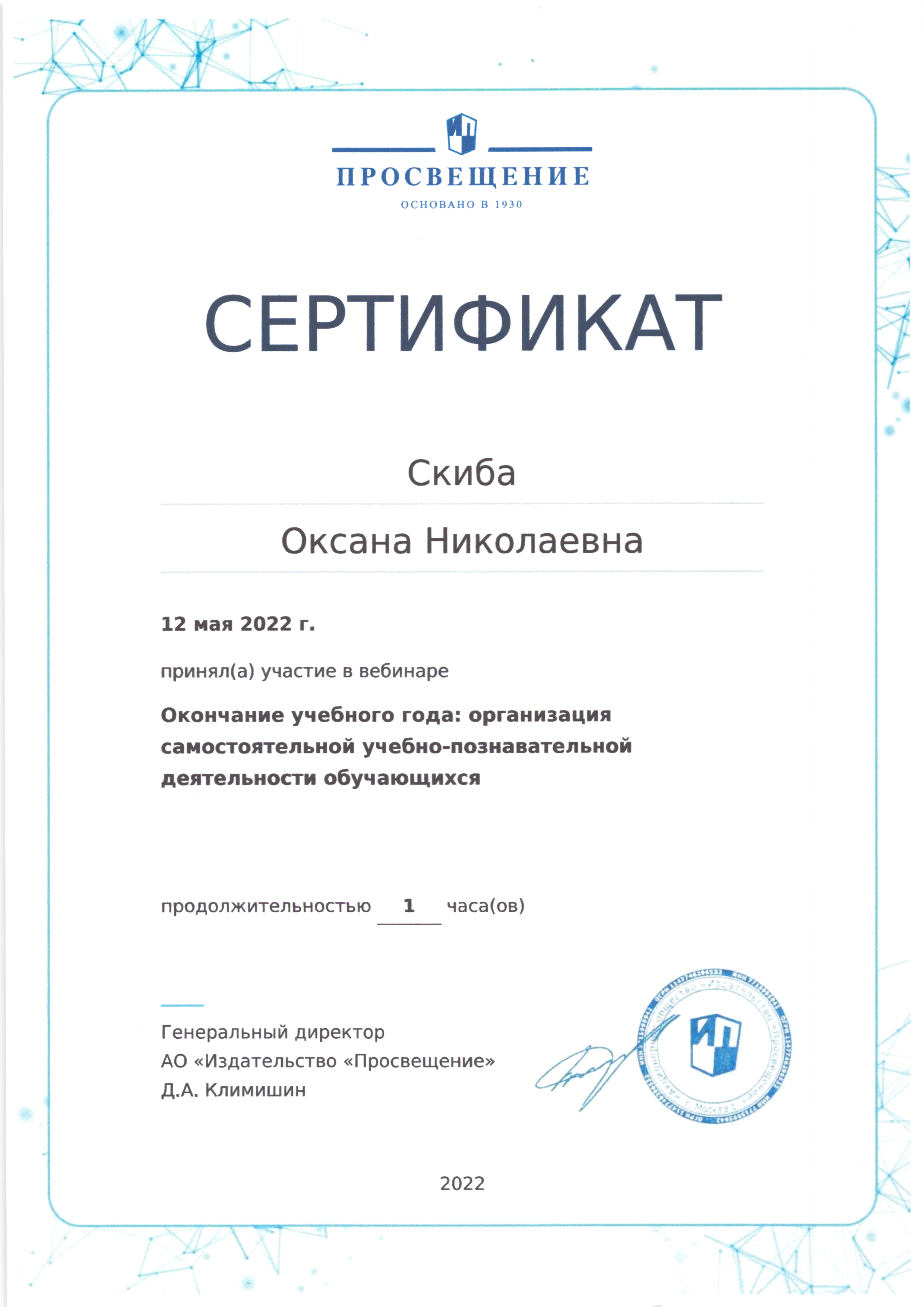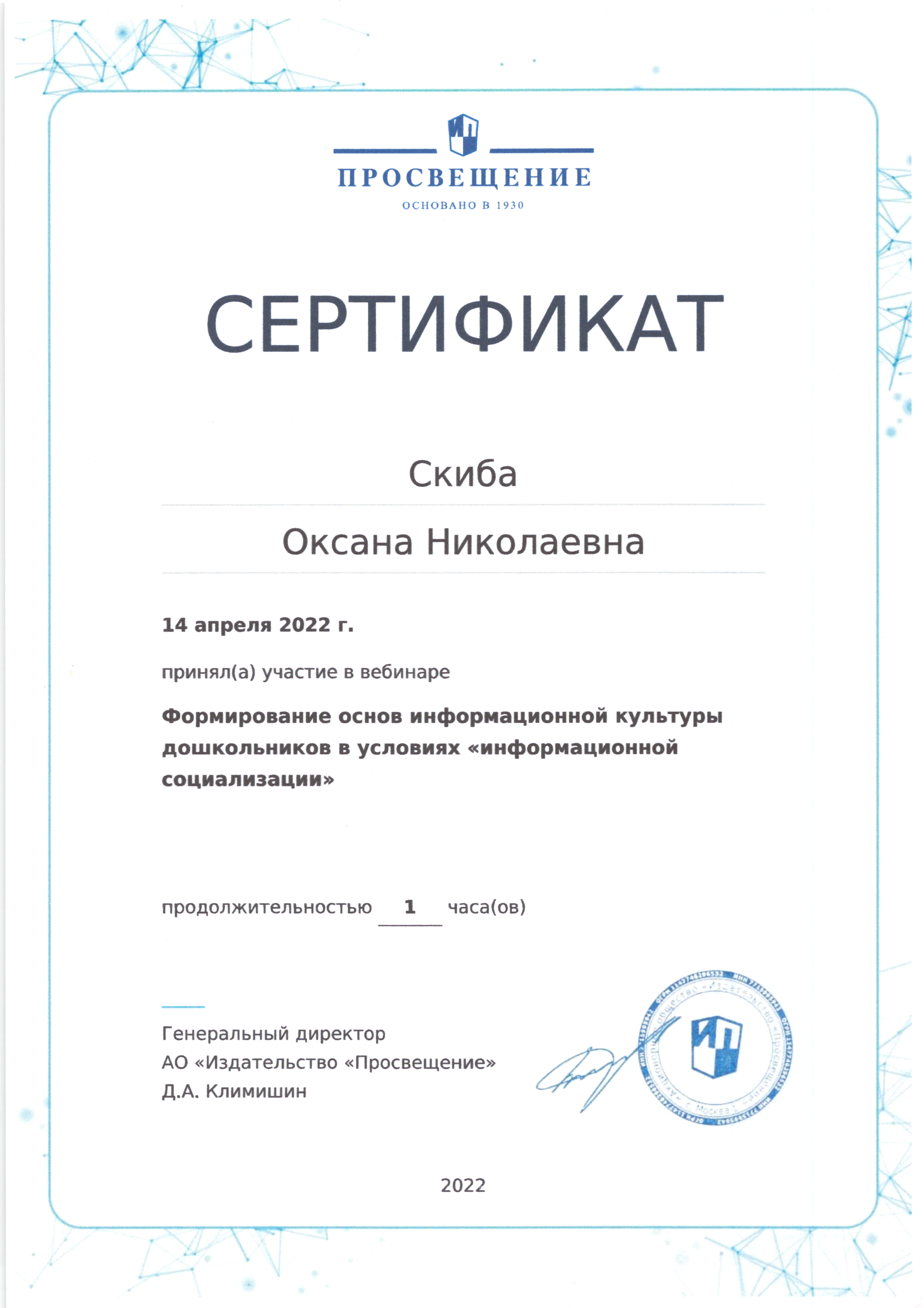 | Фамилия, имя, отчество | Скиба Оксана Николаевна |