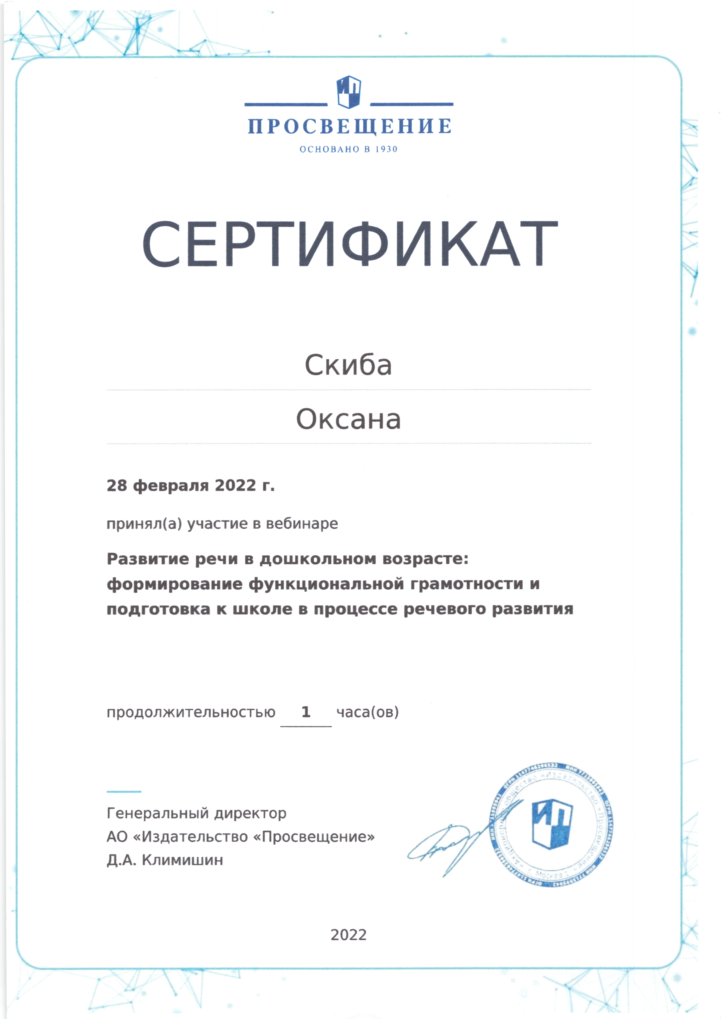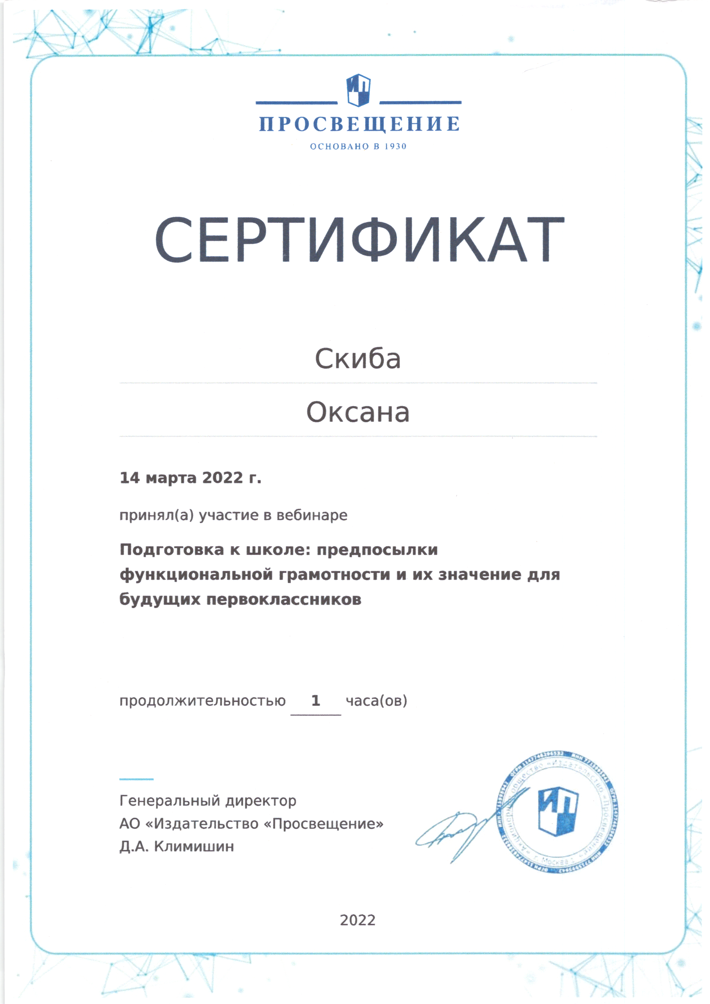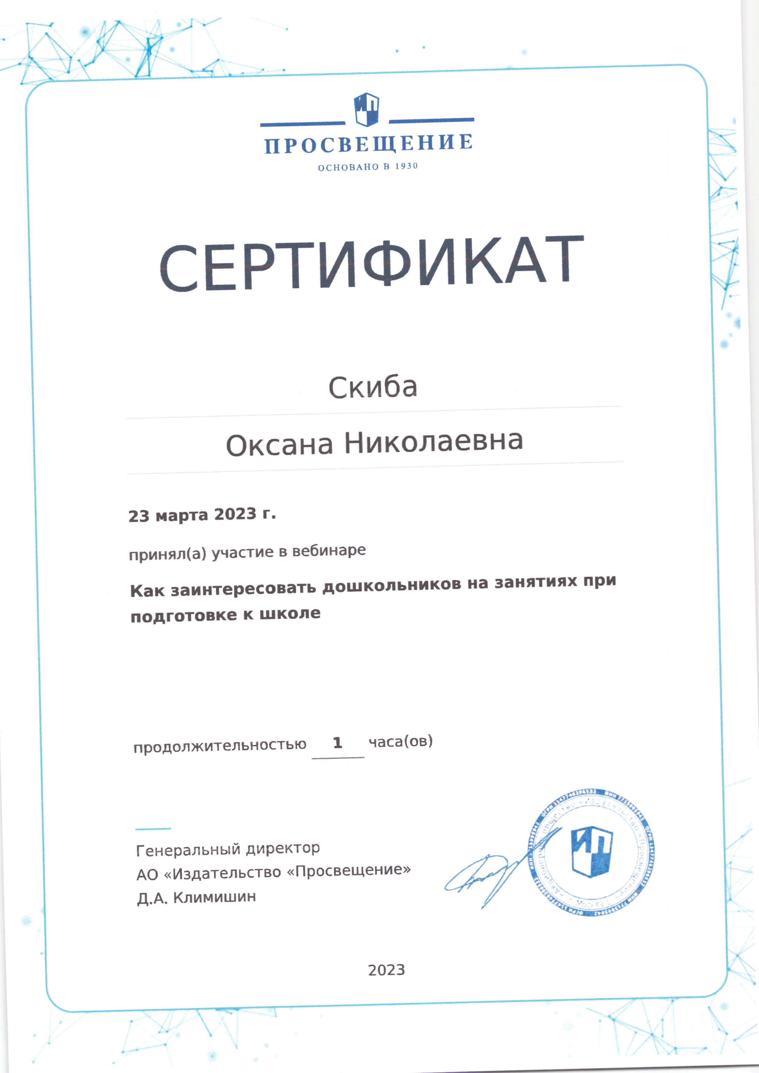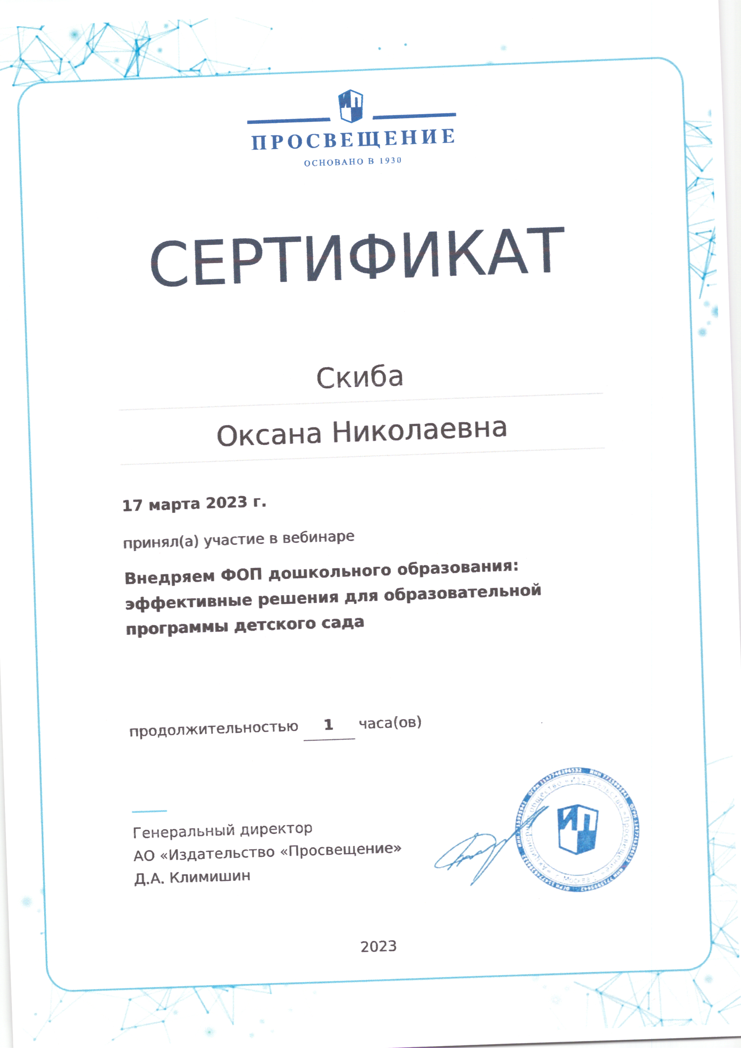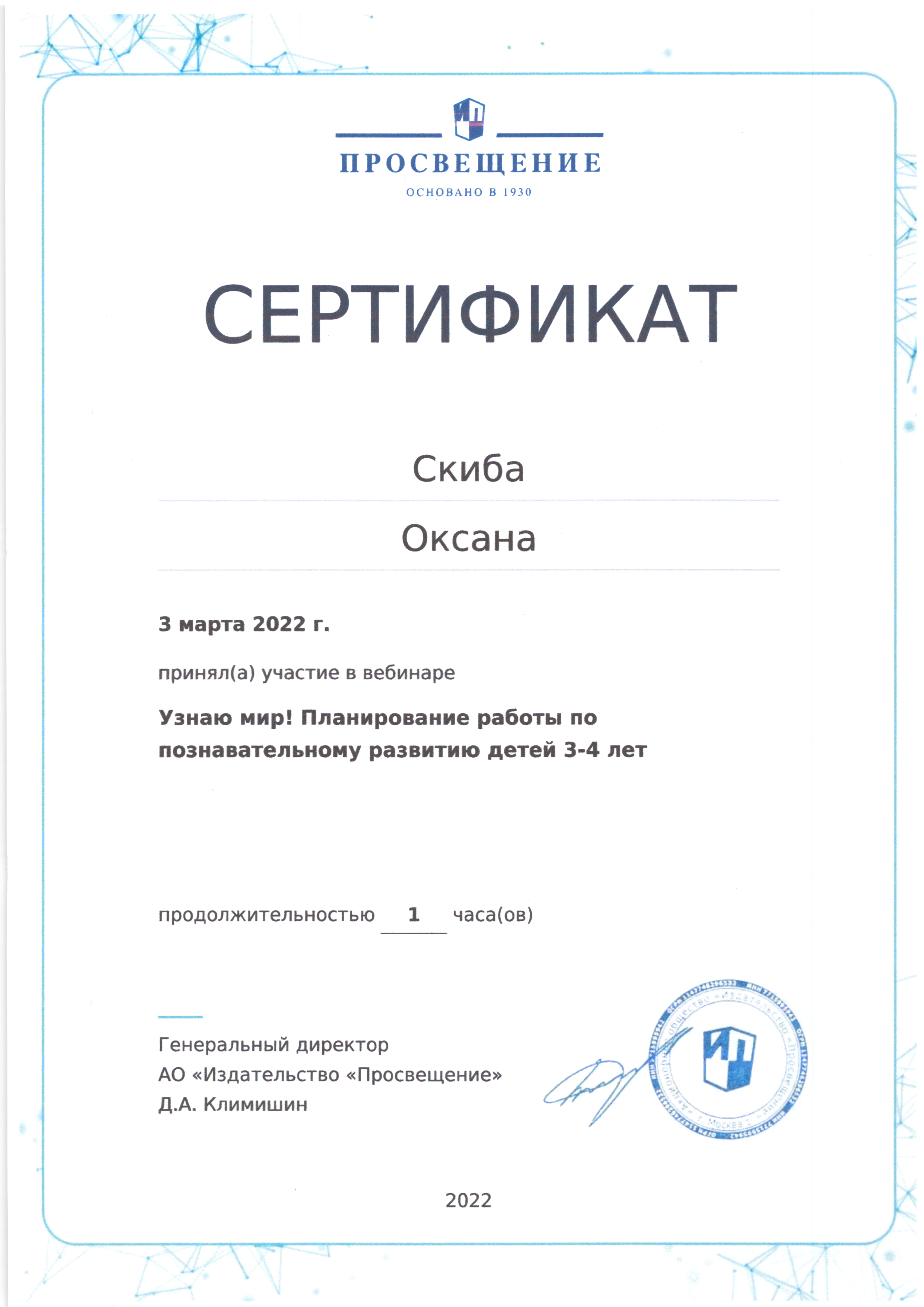 | Фамилия, имя, отчество | Скиба Оксана Николаевна |