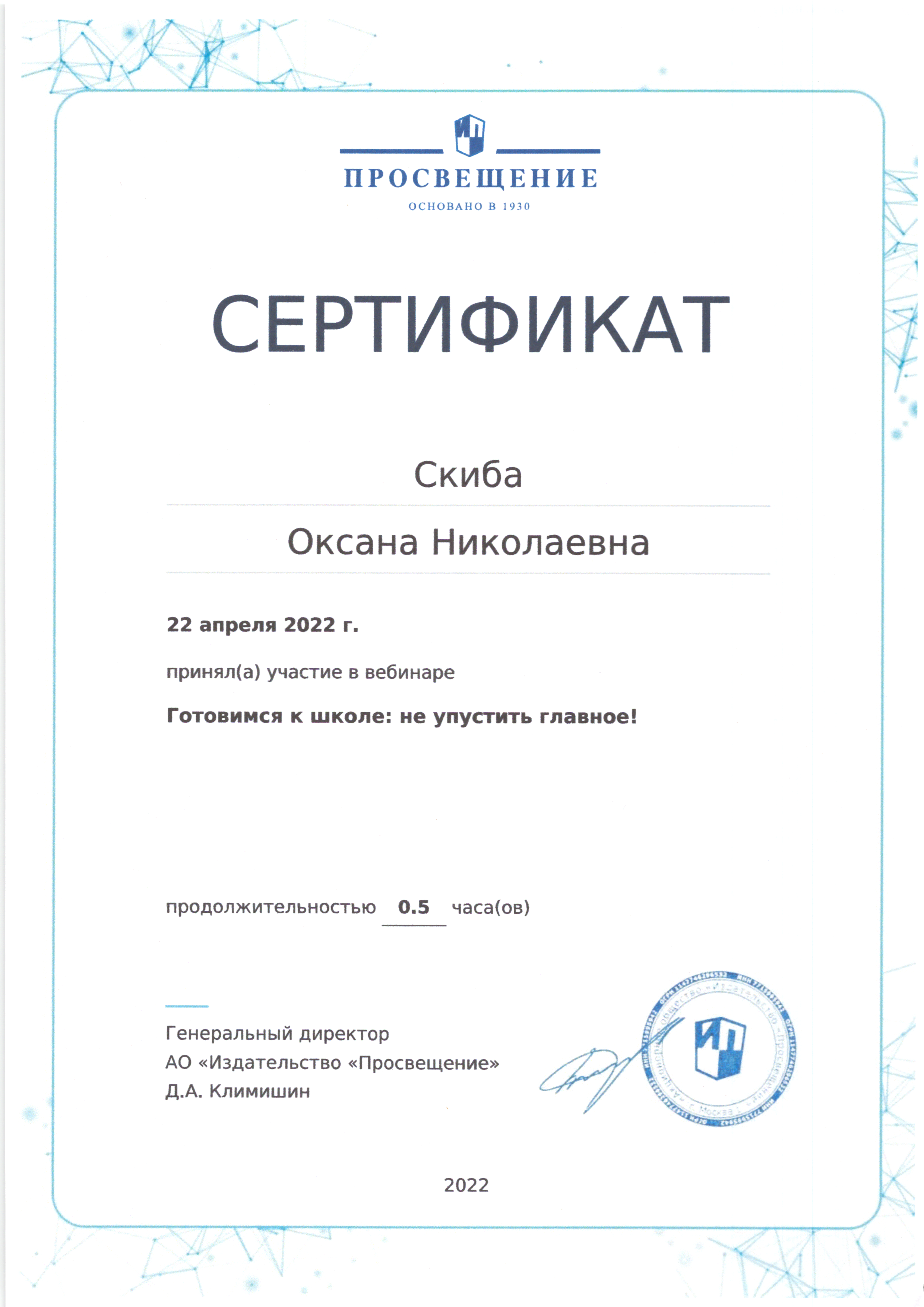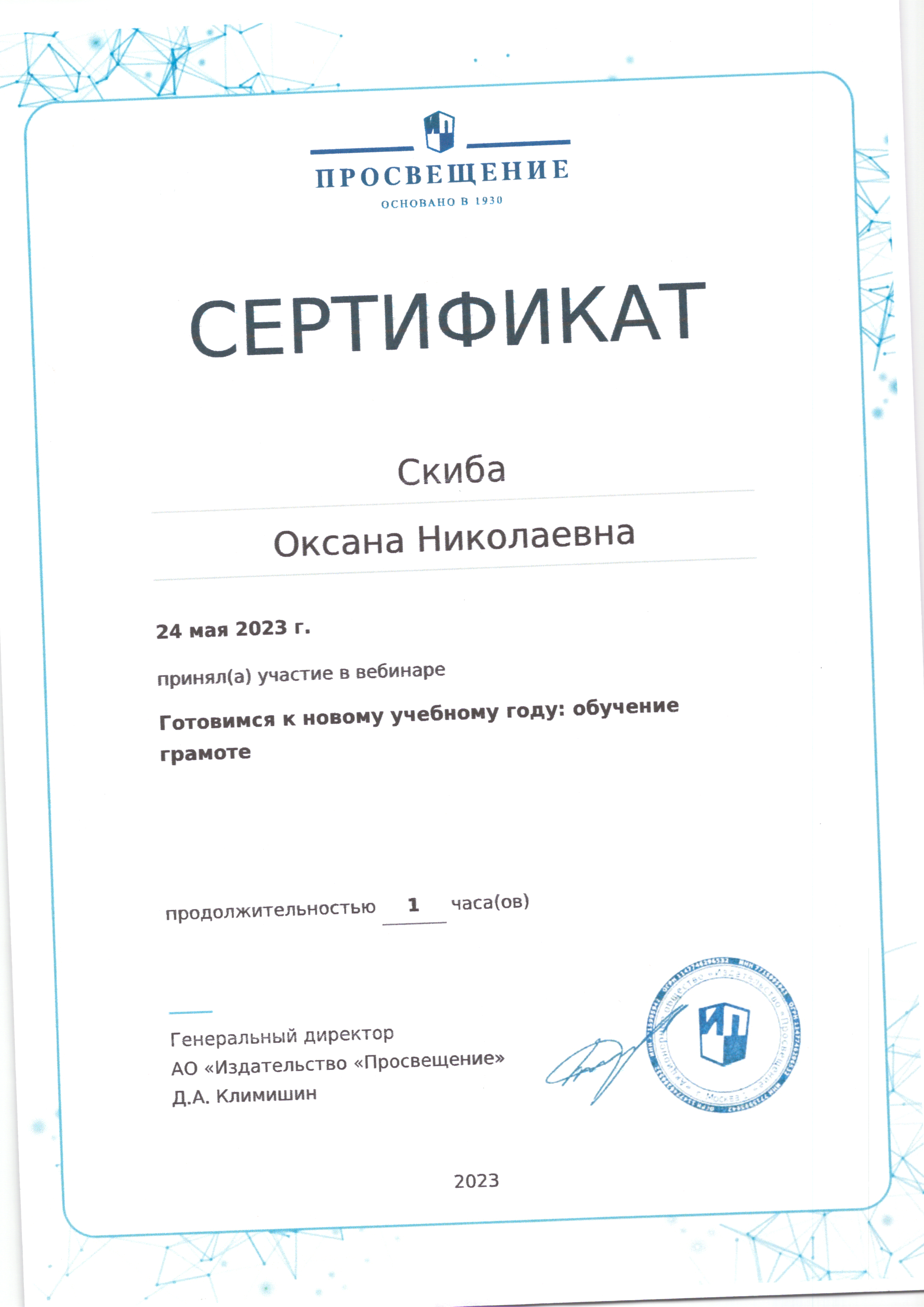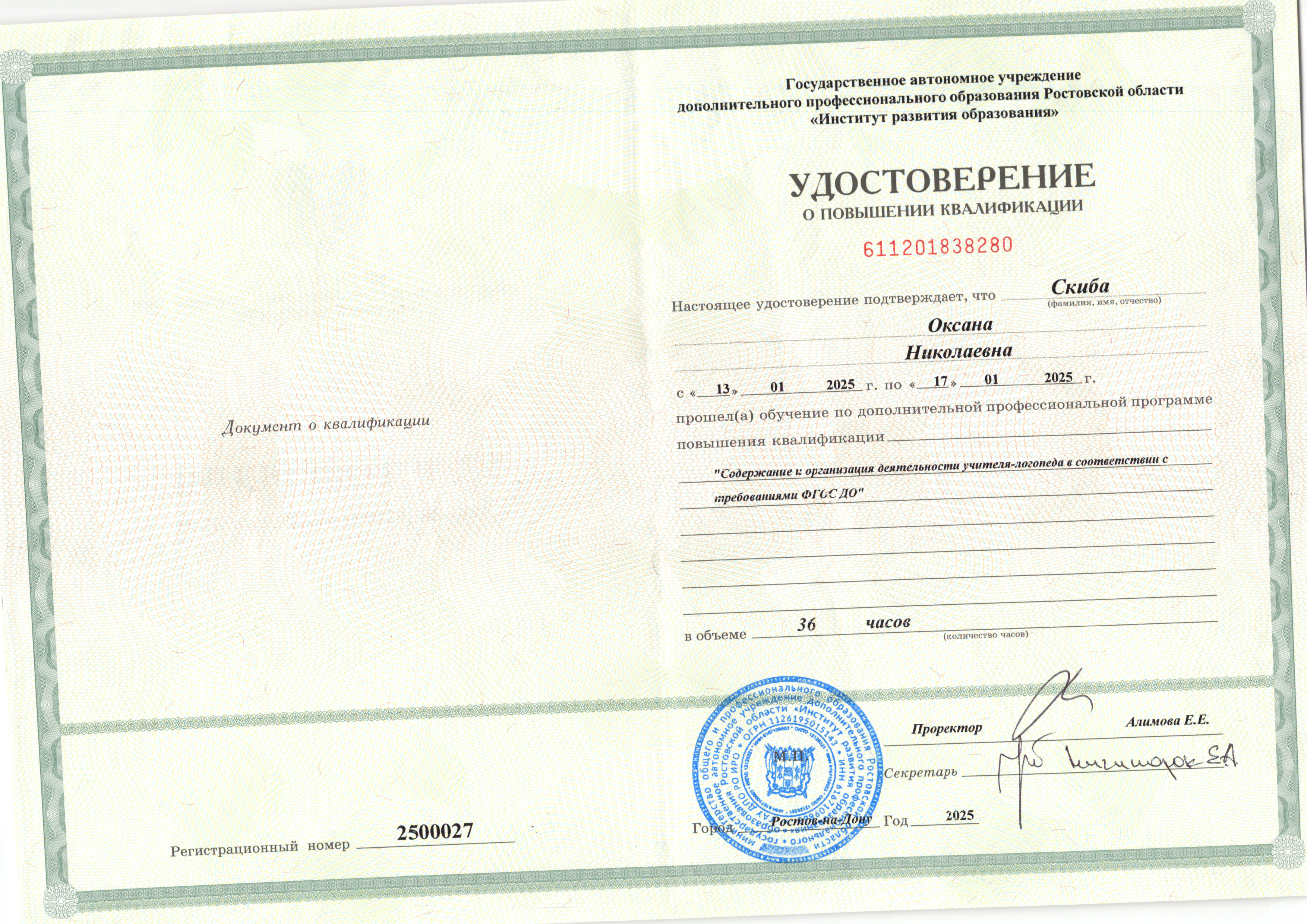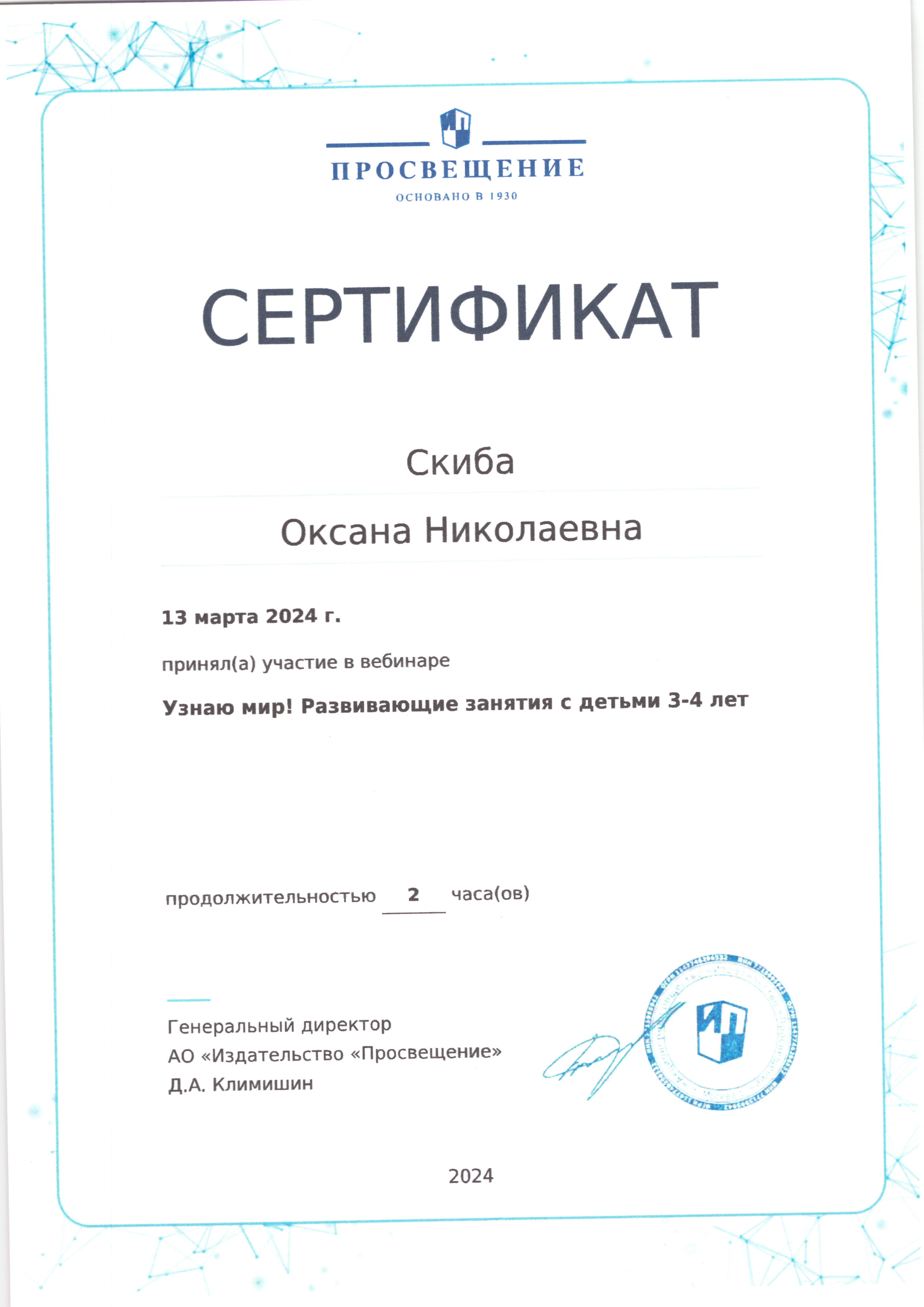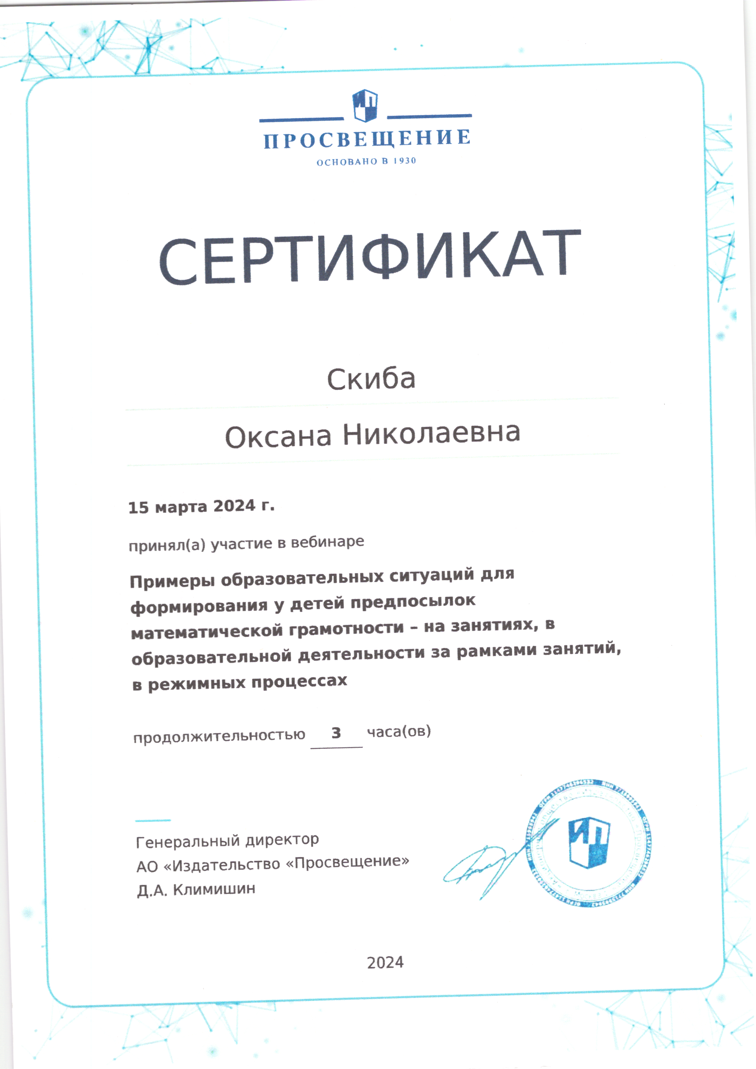 | Фамилия, имя, отчество | Скиба Оксана Николаевна |