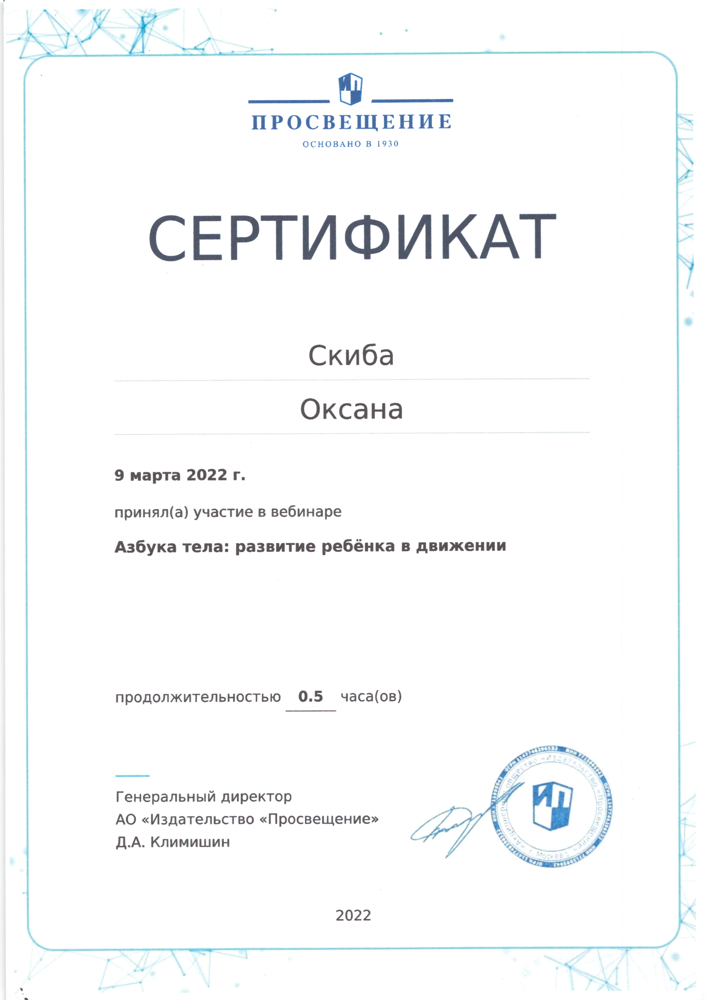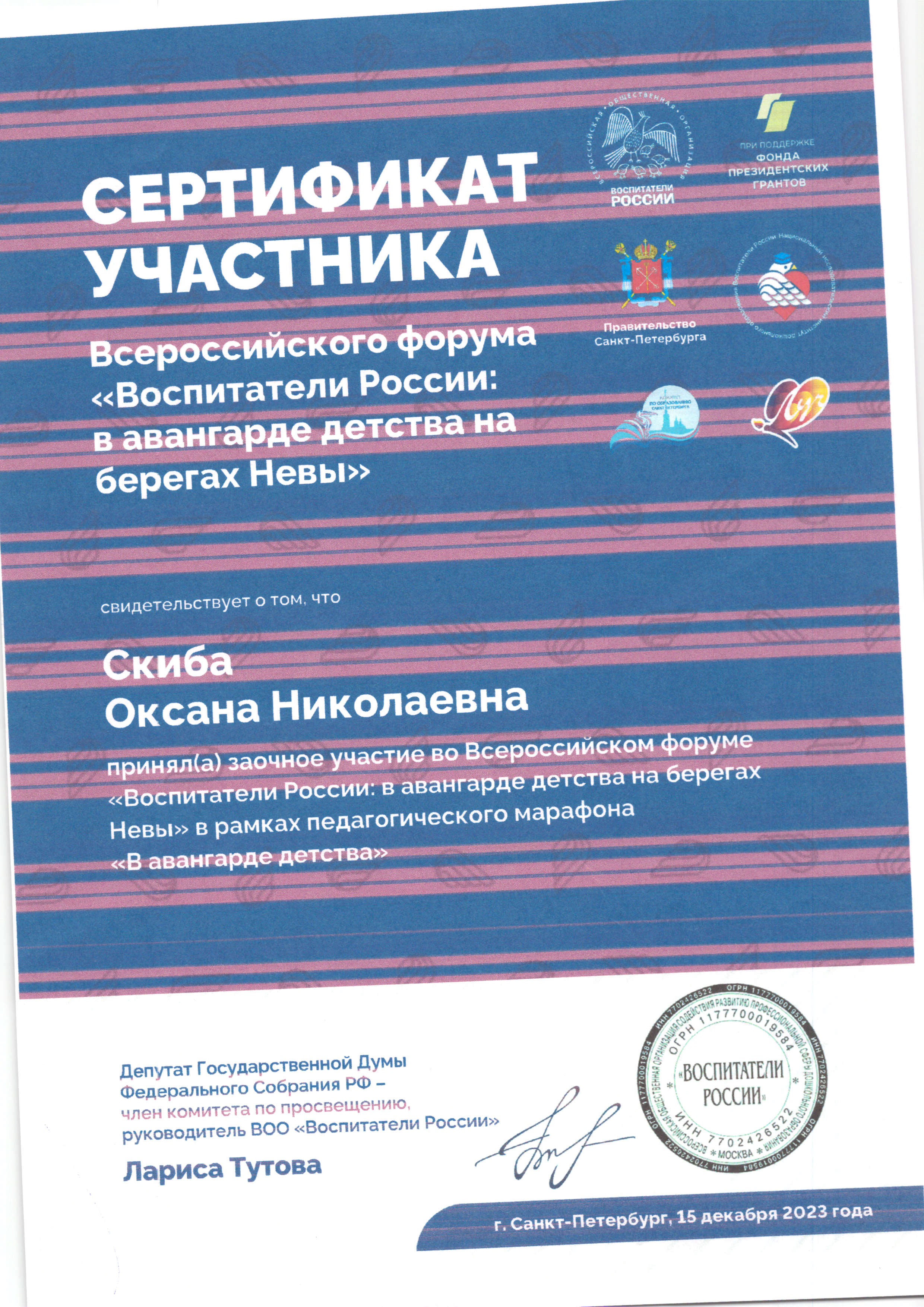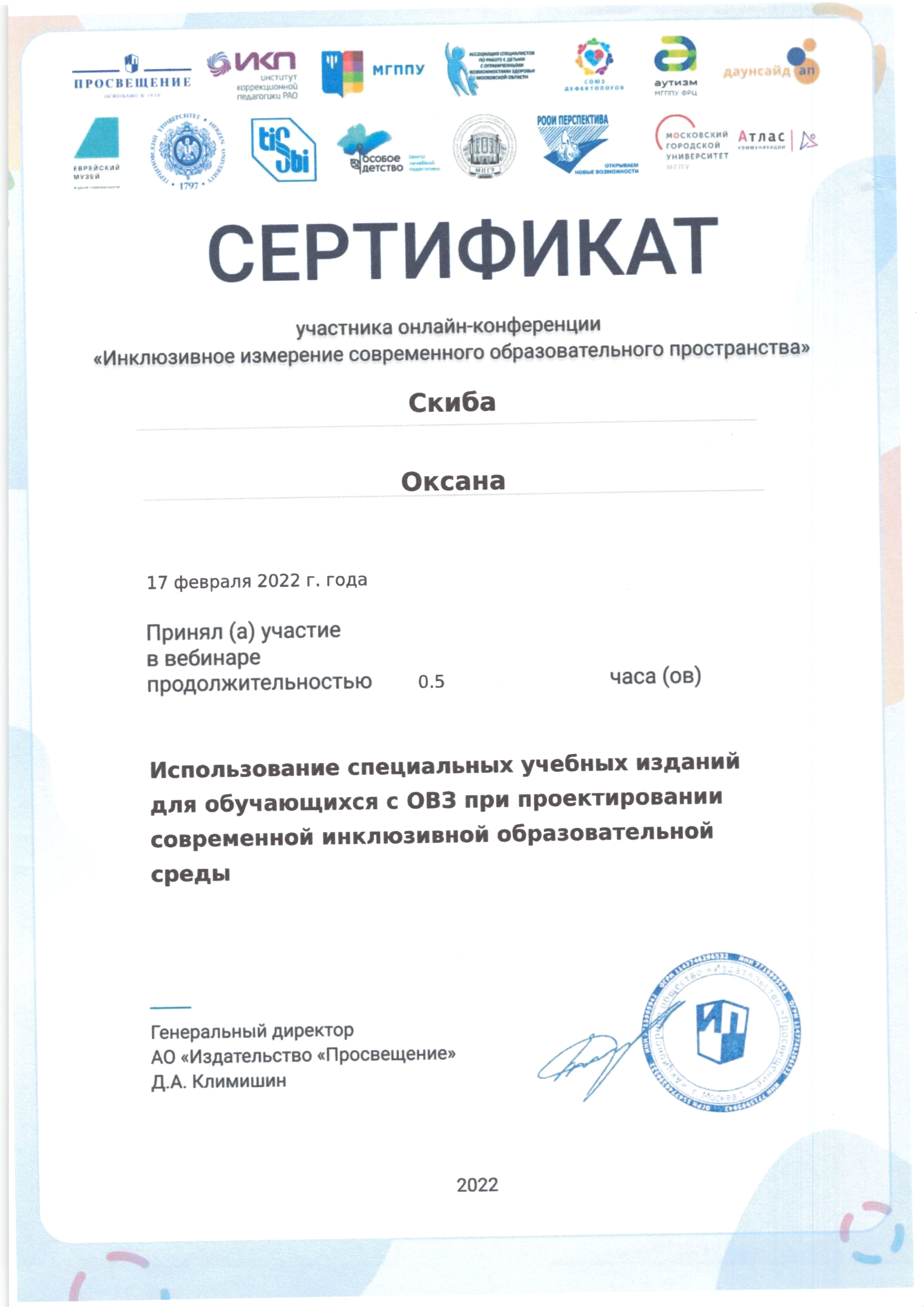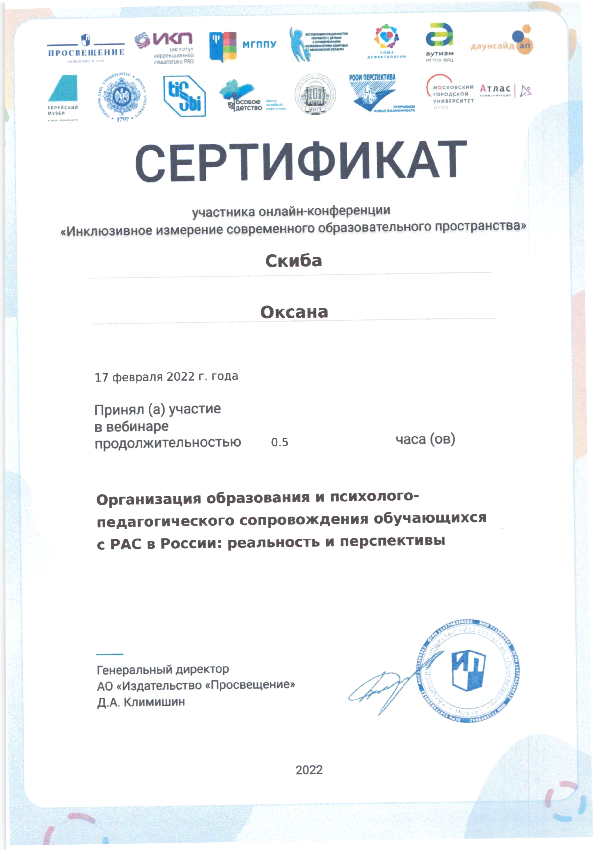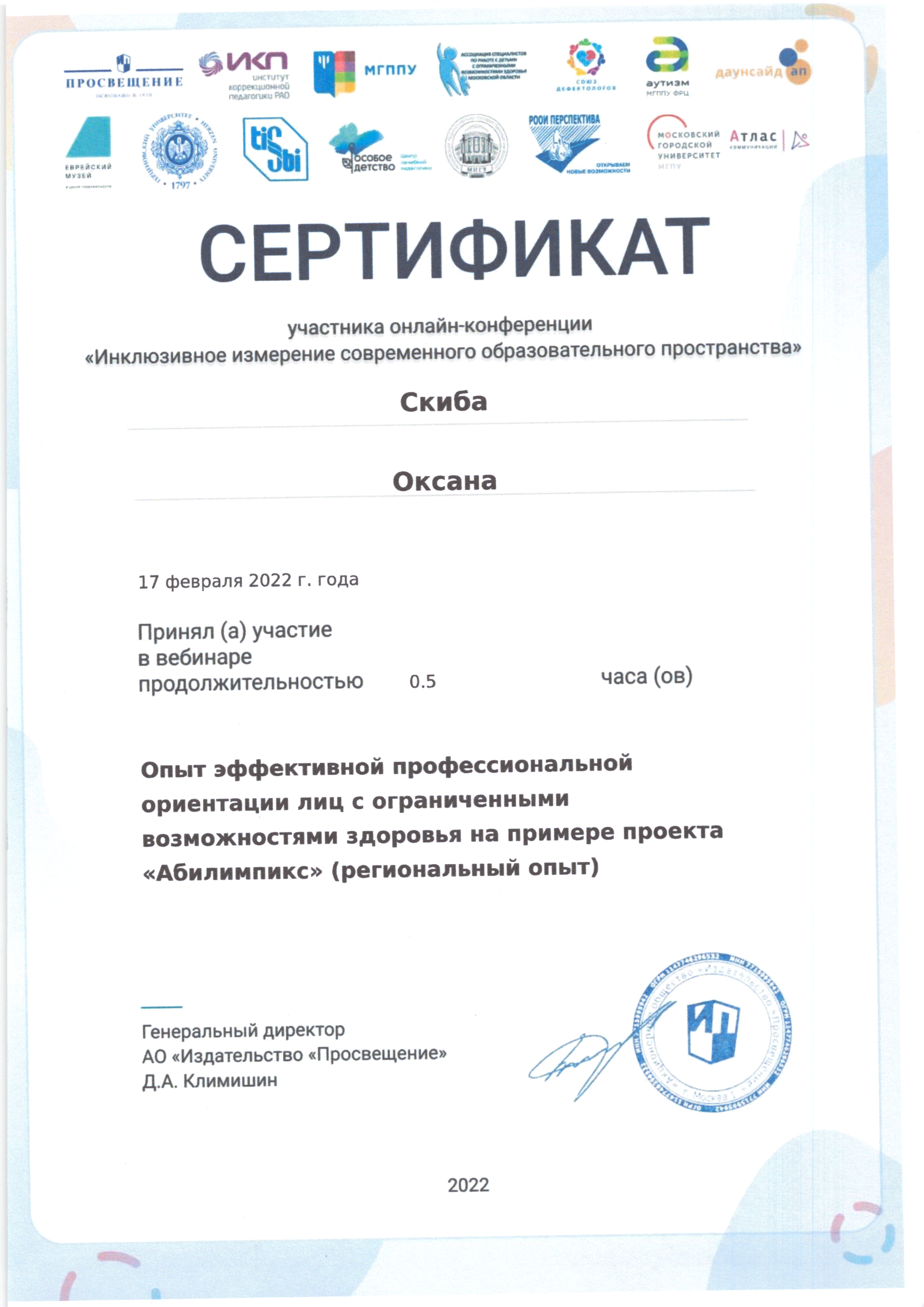 | Фамилия, имя, отчество | Скиба Оксана Николаевна |